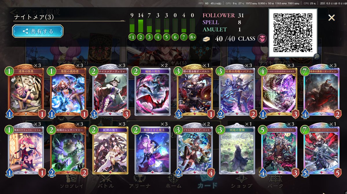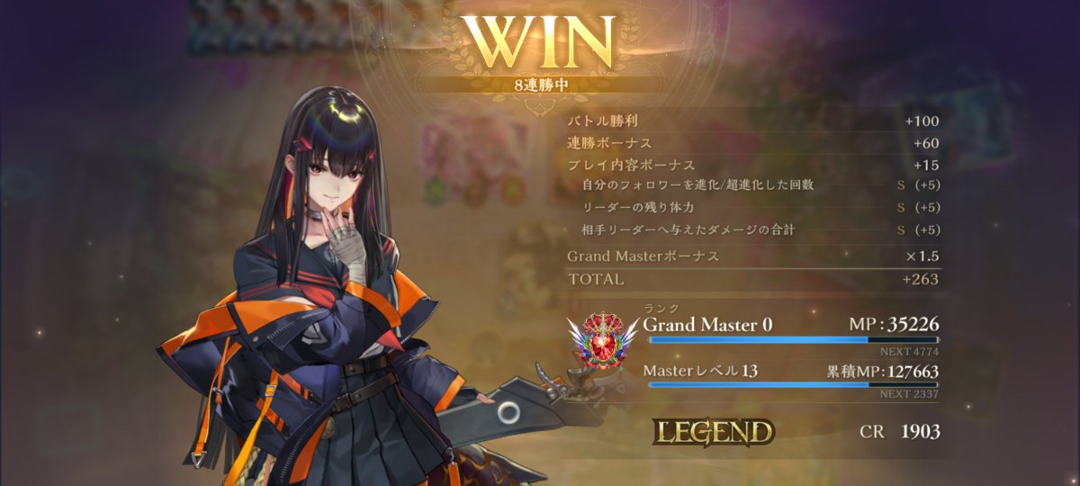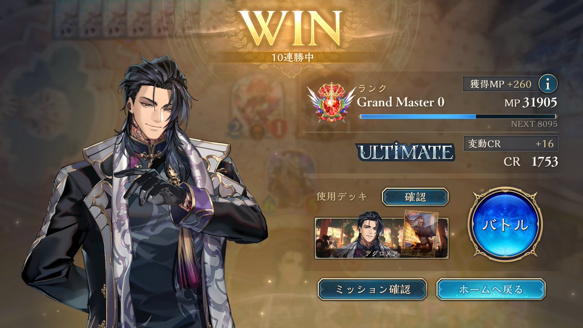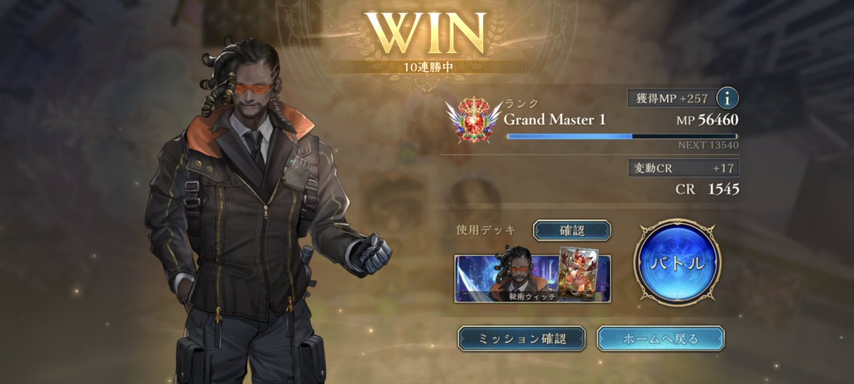 グラマス1到達です。 環境デッキはもちろん、進化エルフやクレストビショップなどの隠れ強デッキまで、幅広く握っています。 最後はAFネメシスで5連勝してグラマス1へ。 AFだとリバイブチューニングでβ連打する型が人気ですが、安定して柔軟に戦う型もAFの長所を活かせていて強いと思います。