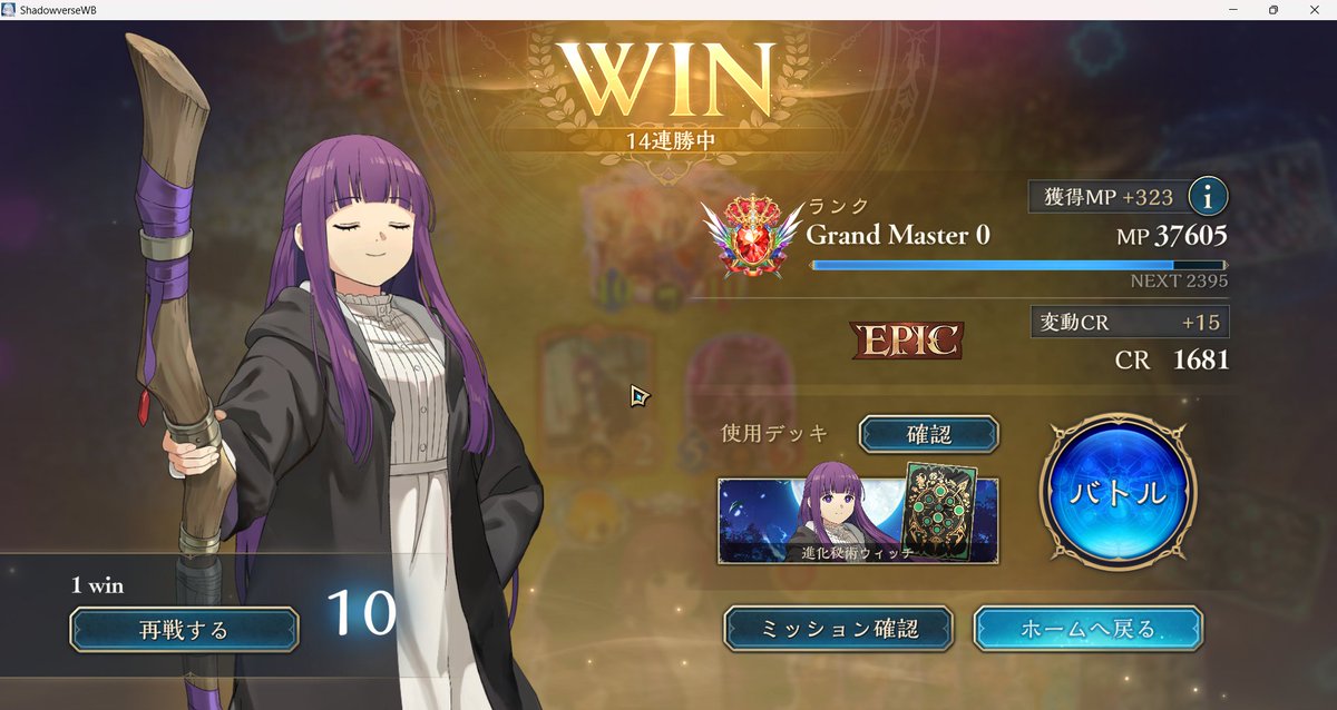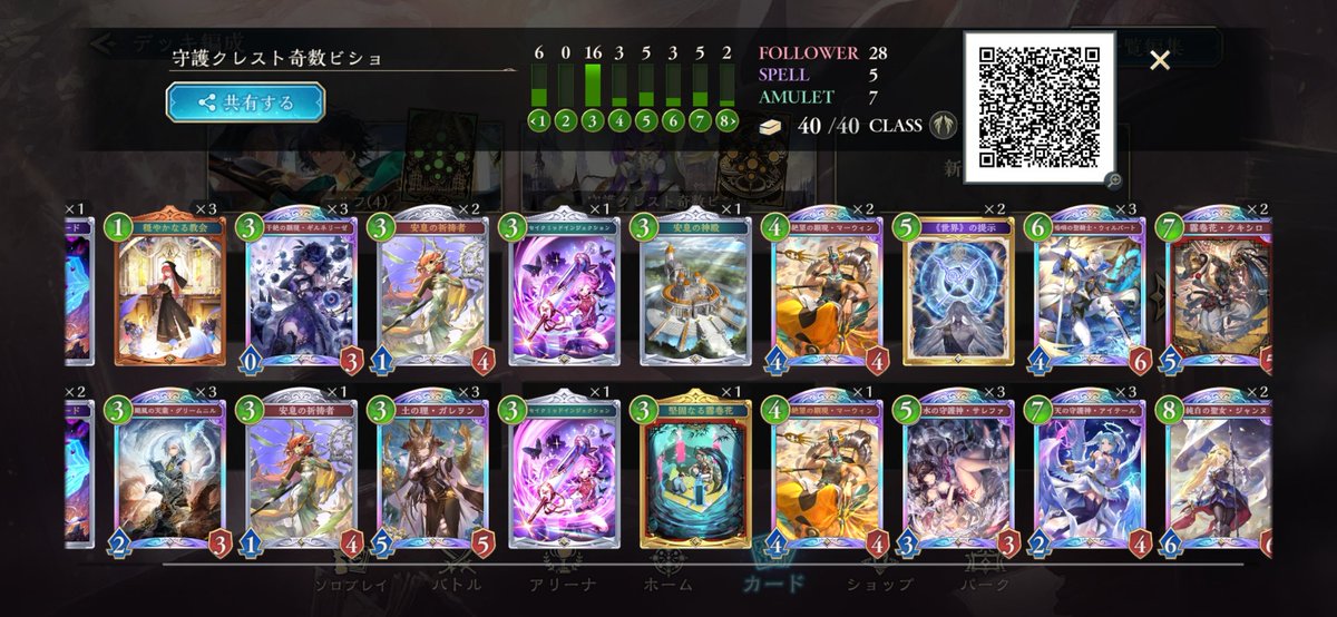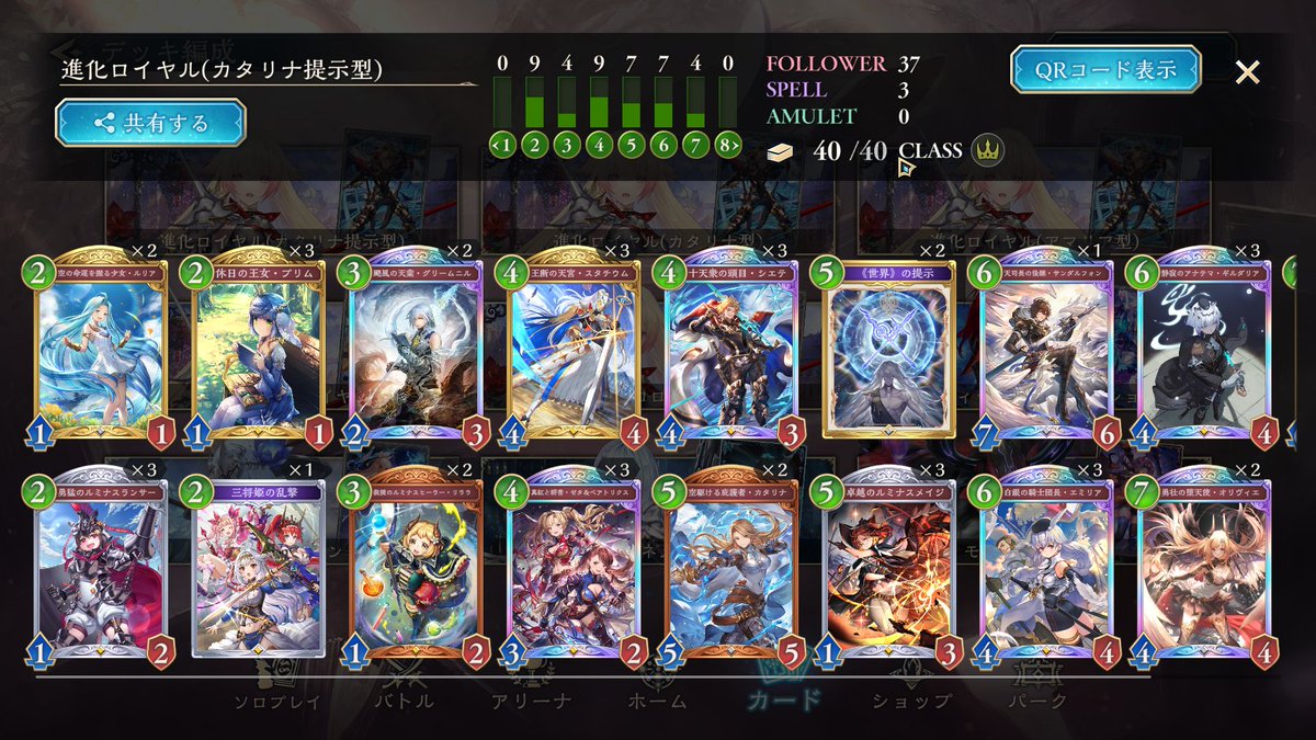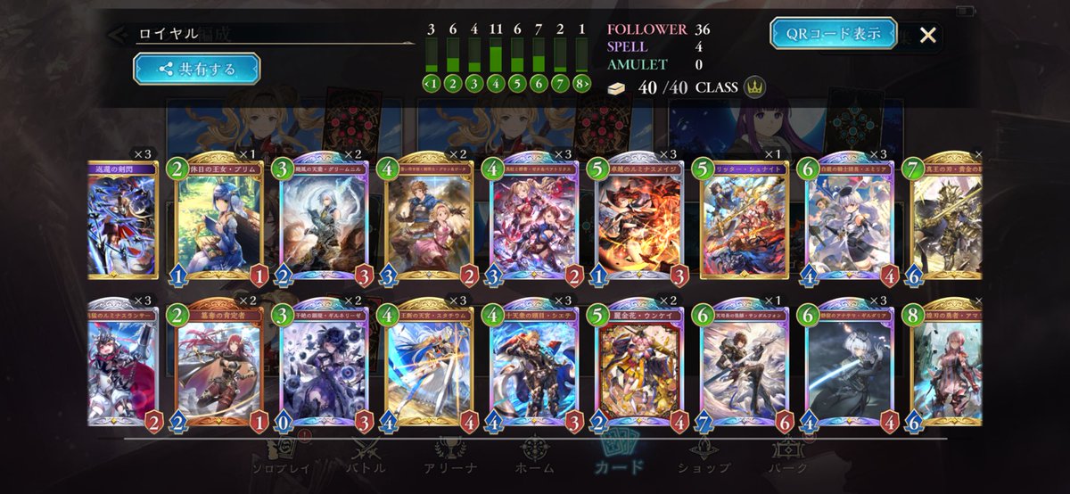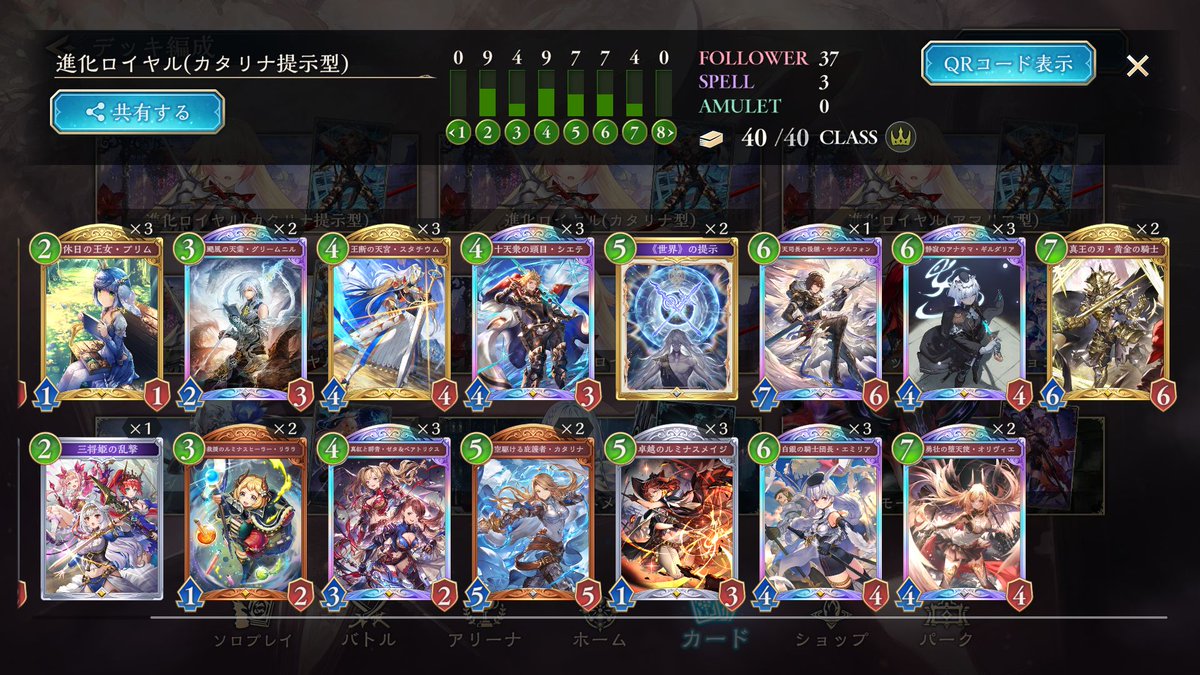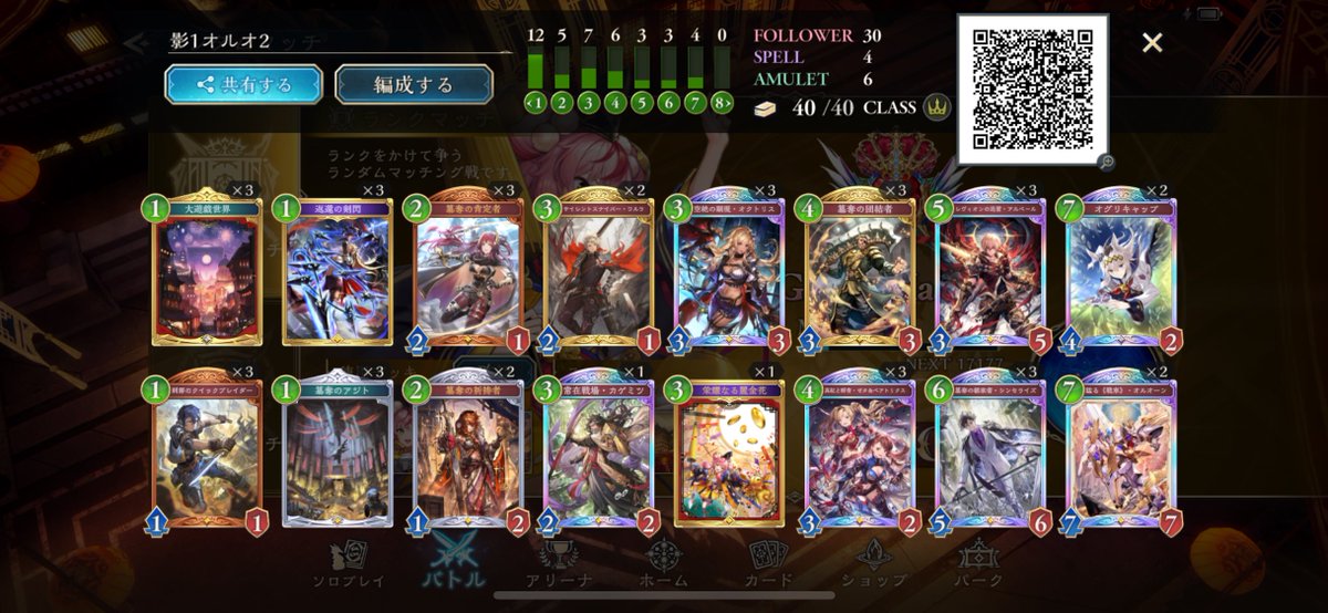 シャドバ 財宝ロイヤルで5連勝してとりあえずレート1687 EPIC👑 オルオーンだけじゃなく黄金騎士まで入れた謎構築ですが 倒しきれないときに黄金騎士の除去と回復で粘り勝ちできたりしました ただご覧の通りドロソがないので出たとこ勝負感は否めない😑 #シャドバWB