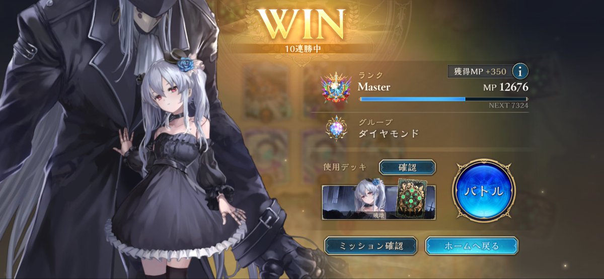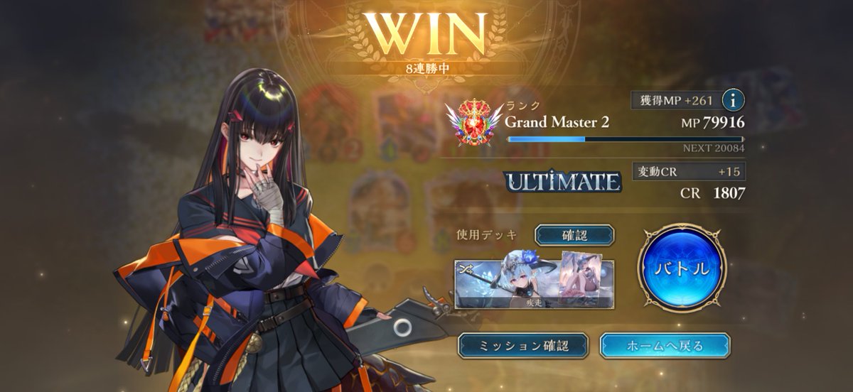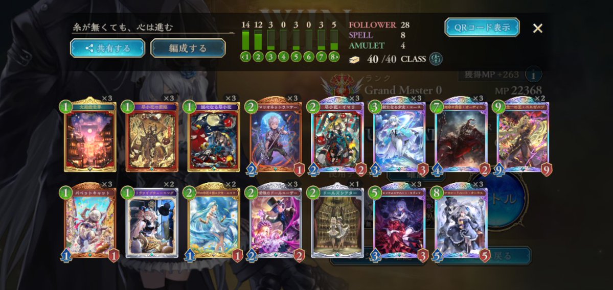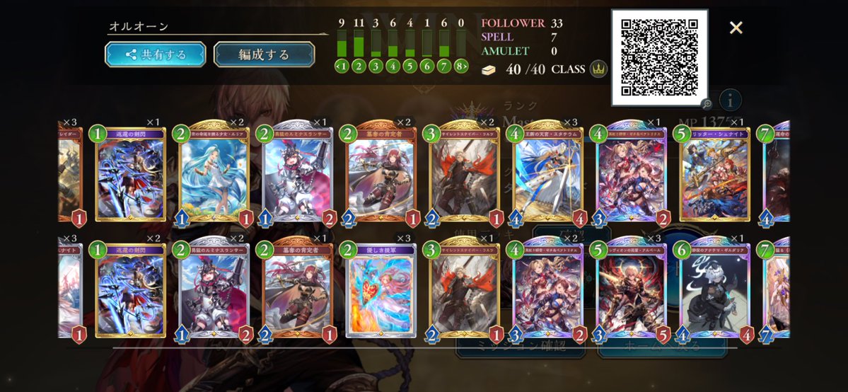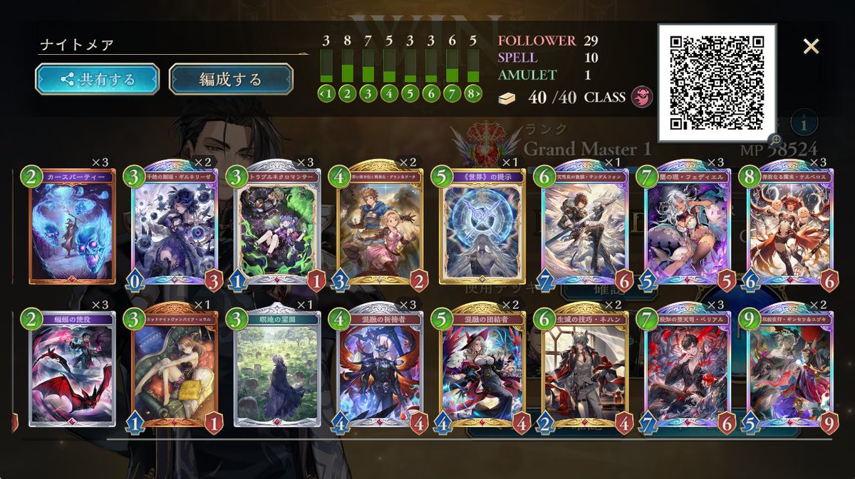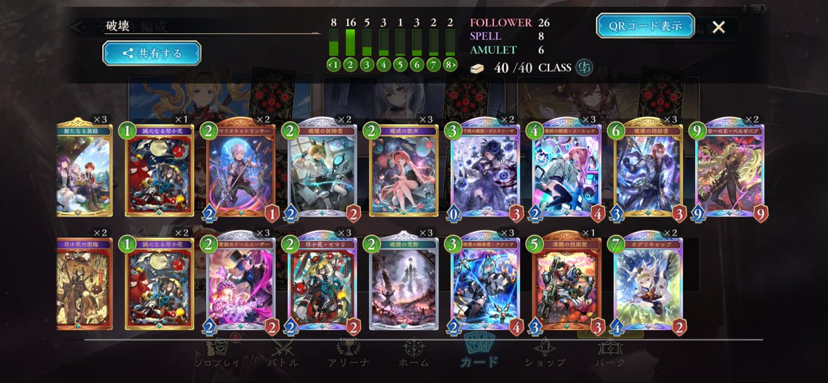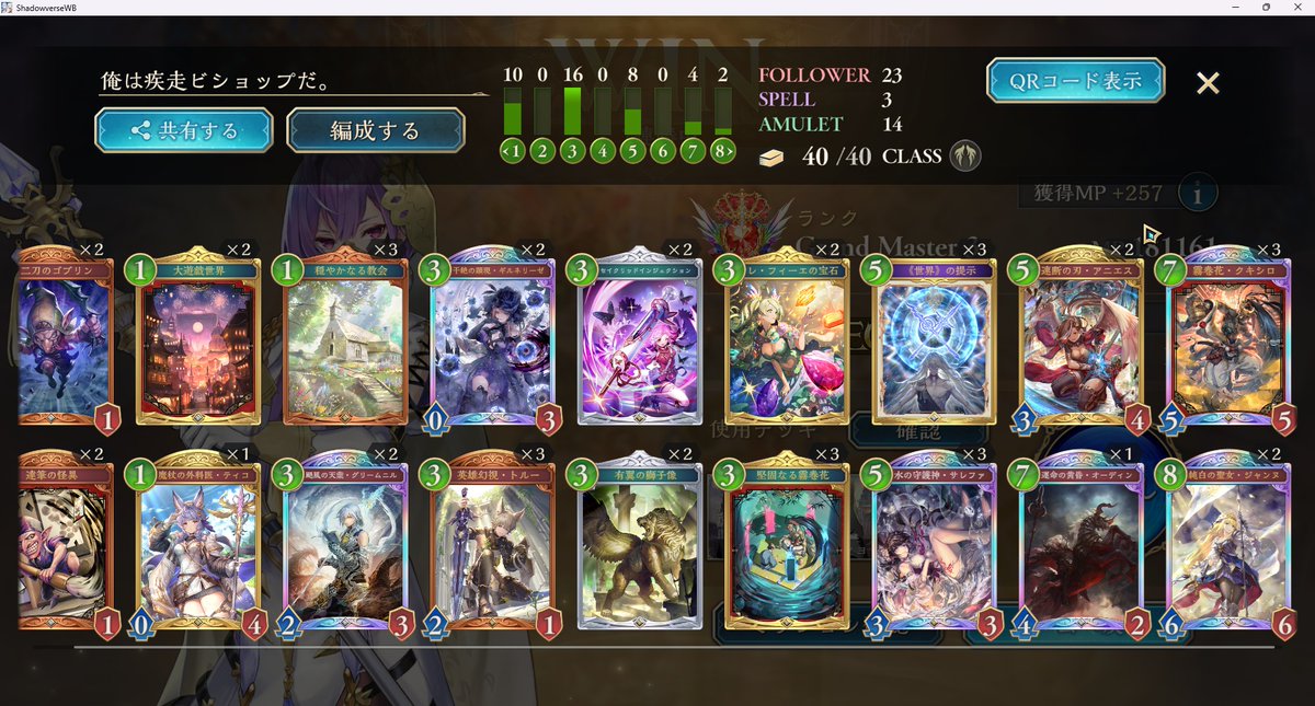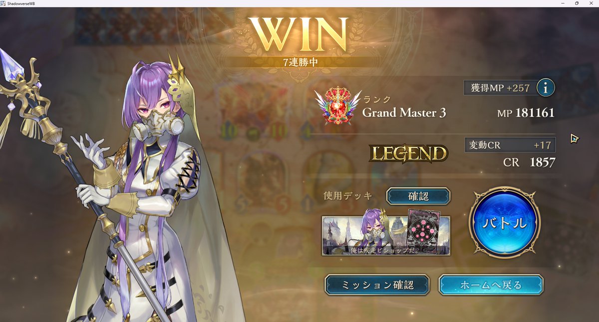 疾走軸の奇数ビショップで7連勝でLEGEND到達しました! あれから構築がぐちゃぐちゃになってしまいましたがやりたいことはできているのでいったん良しとします むしろ手札入れ替えまくるからクキシロ軸はこれ位採用カードが疎らでもいいのではないかと思った #シャドバWB #シャドバ勢と繋がりたい