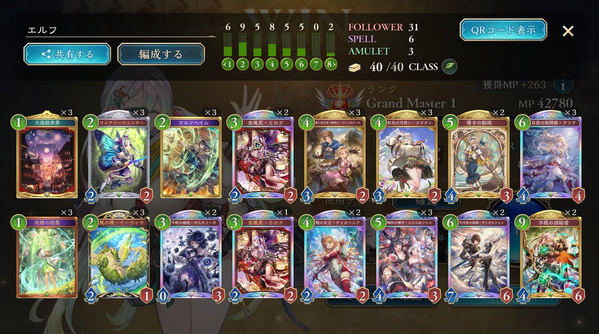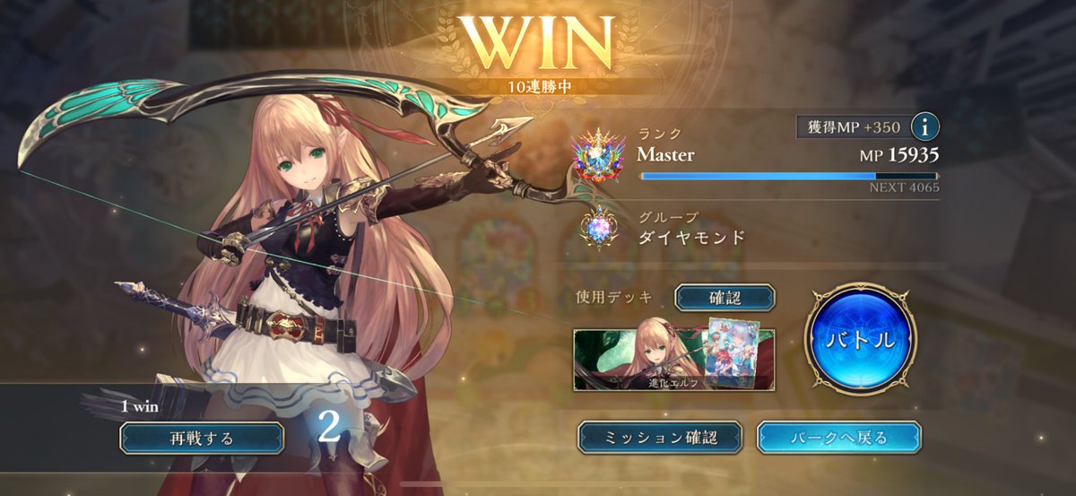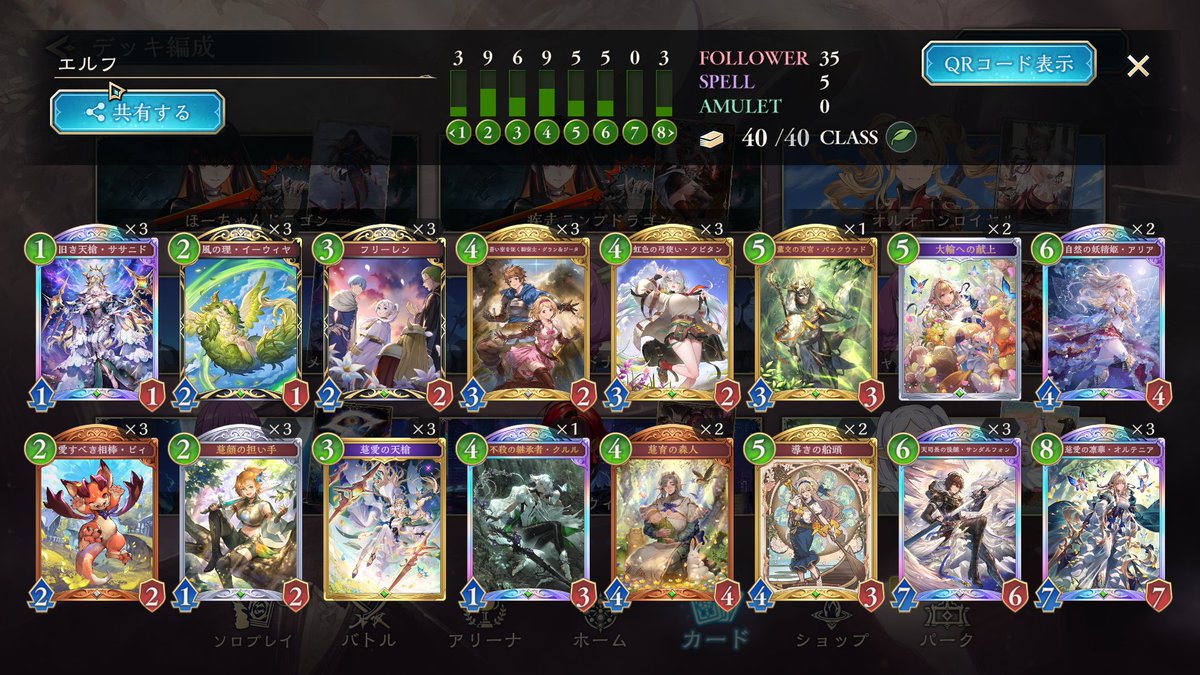 アリア採用の進化エルフで9連勝でEPIC! ササニド引けなかった時のチクチクダメージ兼 ミラーなどの時に妖精疾走のチクチクでサンダルフォン圏内に削ることでサンダルフォン投げ合いを有利に立ち回れます! 船頭はアリアとの相性の良さ+面処理要員として採用! #シャドバWB #デッキ