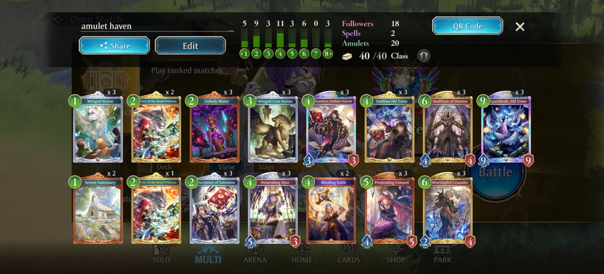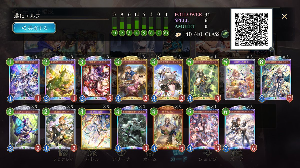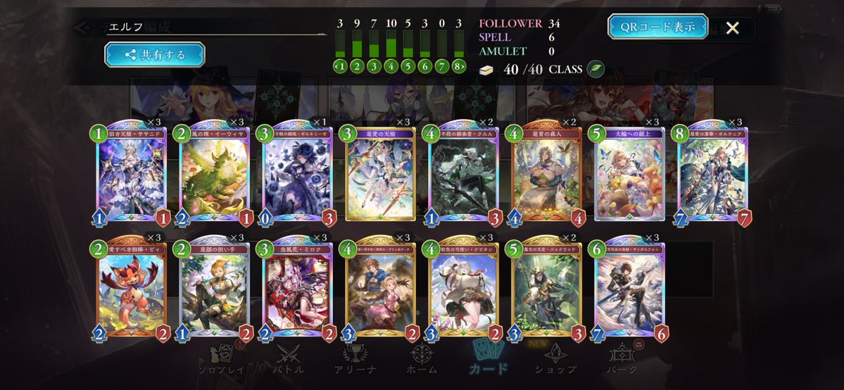 進化エルフ9連勝。 構築全然違う気もするけど、2コス多めに入れたくて10枚。ルリア1枚でも良い気がする。 あとロイヤル相手にクルル欲しい気がするので枠検討🤔 バックウッドはイーウィヤでEP戻せるから後でも使えるしリソース増えるからこのまま2枚で良い気がするんだよな~~ #シャドバ
