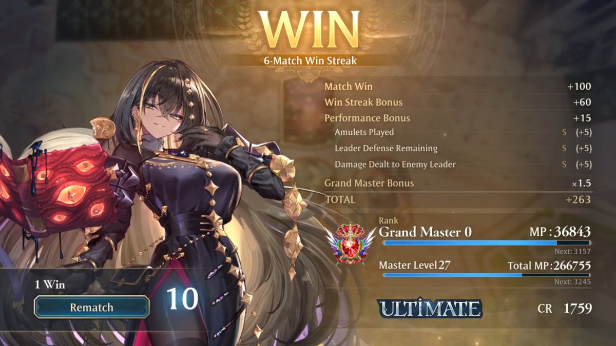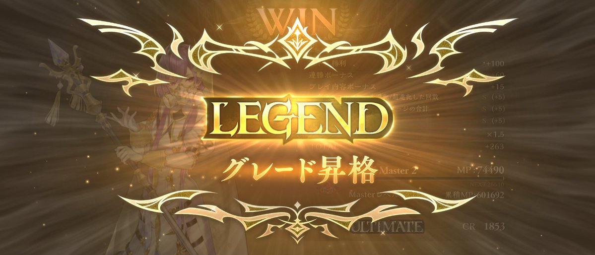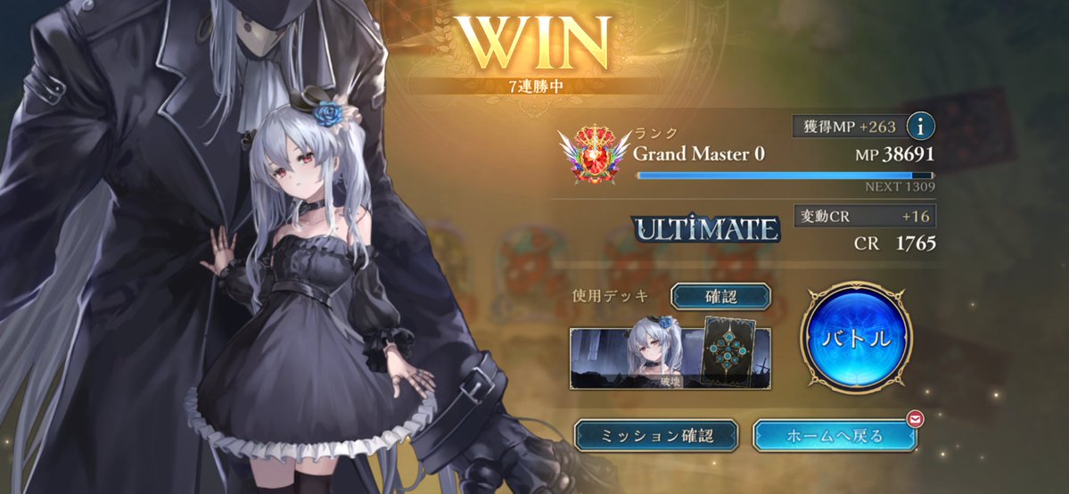 7連勝でアルティメットきた! 最初順調良くてアルティメ手前までは行けてたのにそっから連敗続いて一時期CR1500台まで下がったけどなんとかここまで来れた #シャドバWB