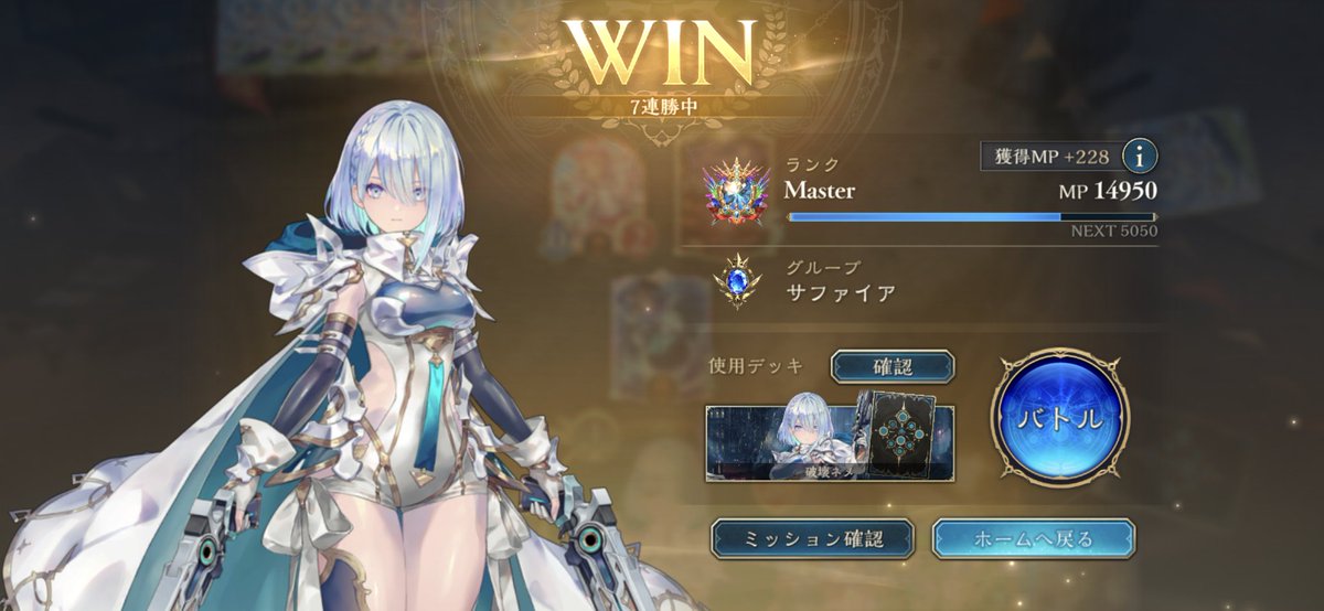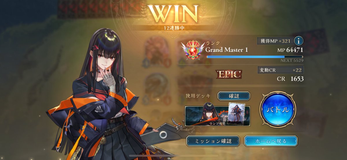 CRちょっと溶かしてたけどリスト変えて7連勝してEPIC舞い戻ってまいりました グランジータか奏楽か決めきれない優柔不断さが出ている #シャドバWB #ほーちゃんドラゴン