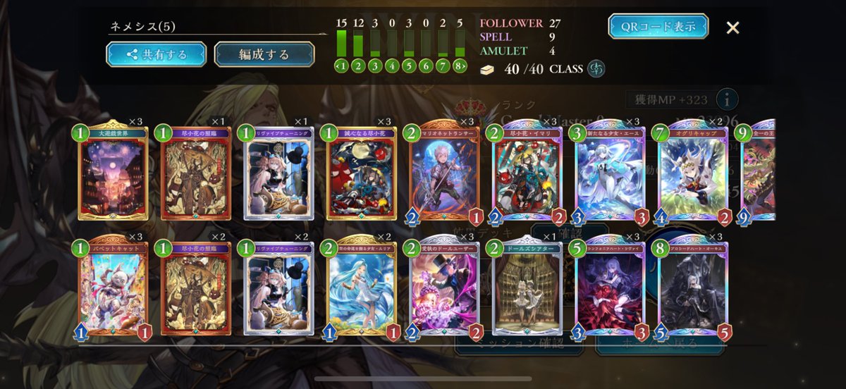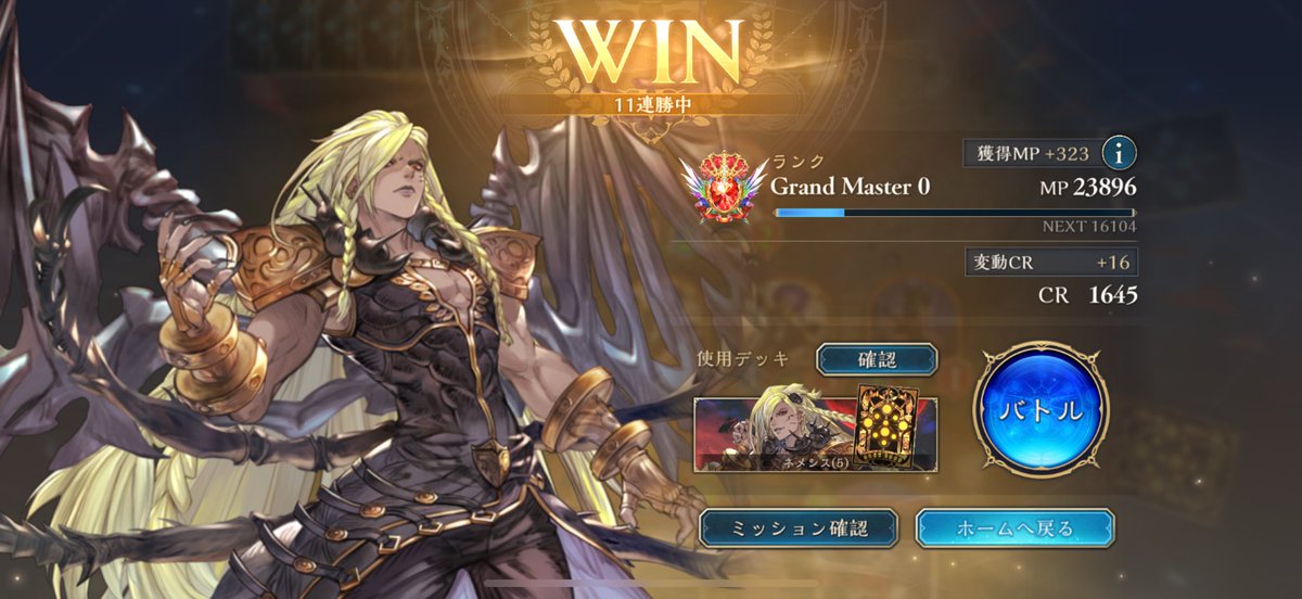 グラマス1到達です。 環境デッキはもちろん、進化エルフやクレストビショップなどの隠れ強デッキまで、幅広く握っています。 最後はAFネメシスで5連勝してグラマス1へ。 AFだとリバイブチューニングでβ連打する型が人気ですが、安定して柔軟に戦う型もAFの長所を活かせていて強いと思います。