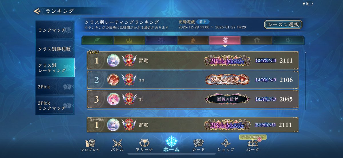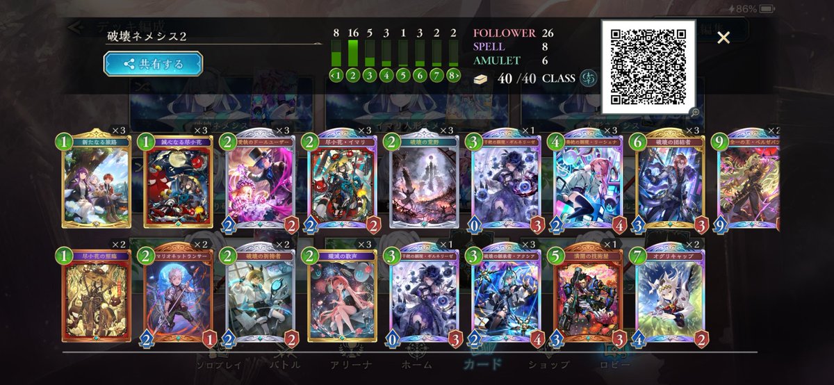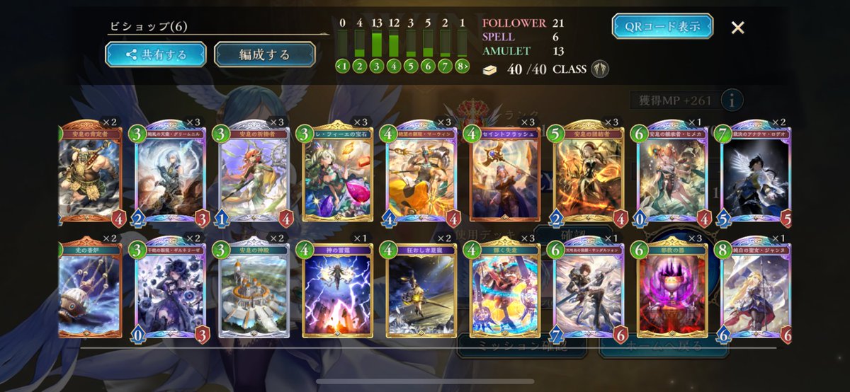 疾走軸の奇数ビショップで7連勝でLEGEND到達しました! あれから構築がぐちゃぐちゃになってしまいましたがやりたいことはできているのでいったん良しとします むしろ手札入れ替えまくるからクキシロ軸はこれ位採用カードが疎らでもいいのではないかと思った #シャドバWB #シャドバ勢と繋がりたい