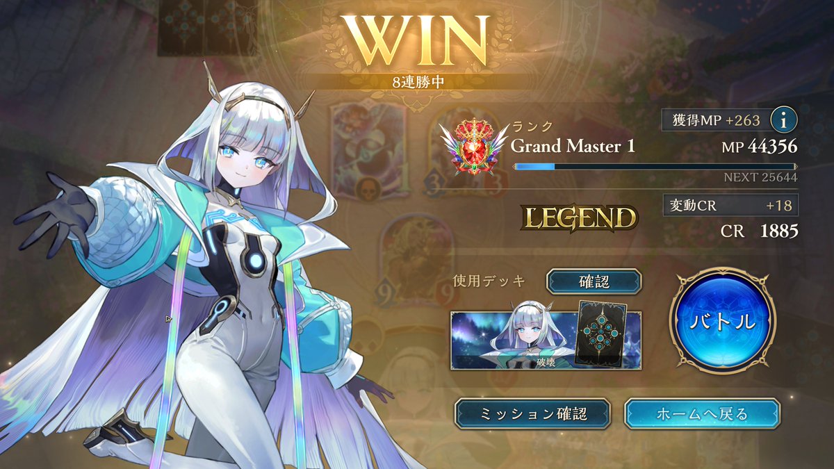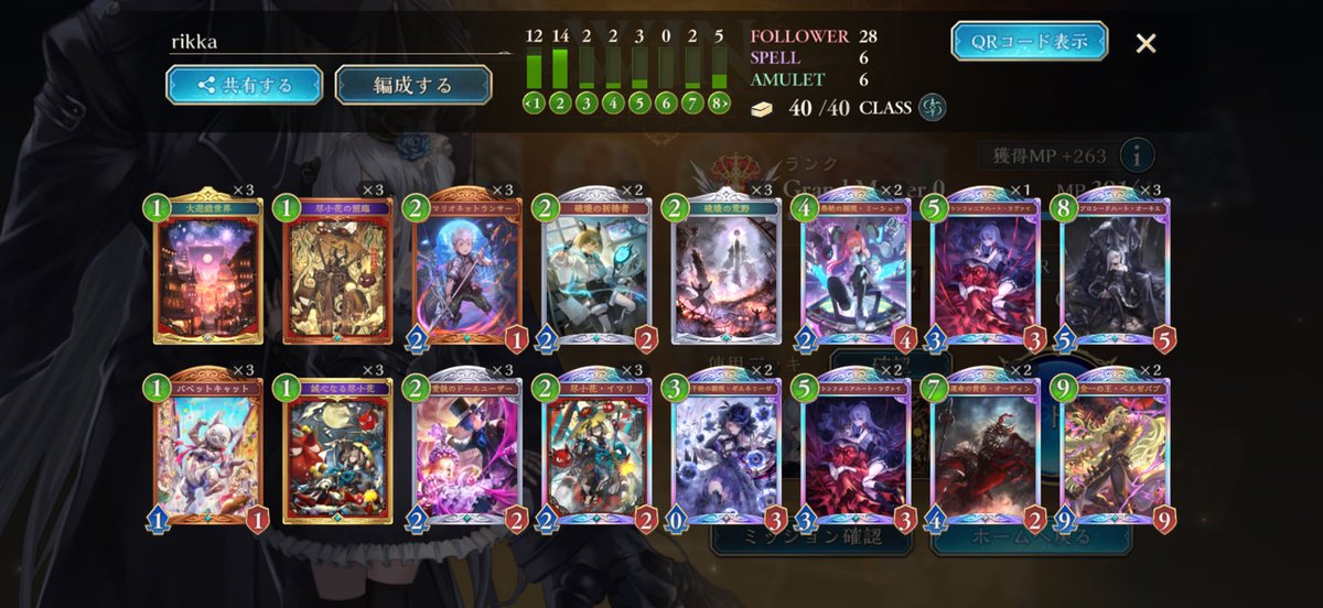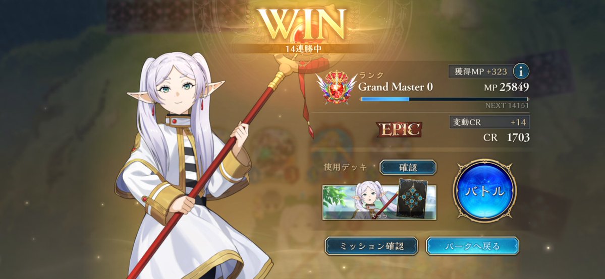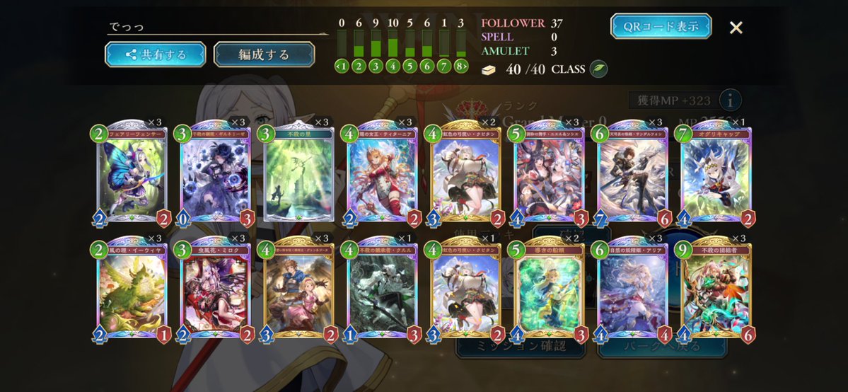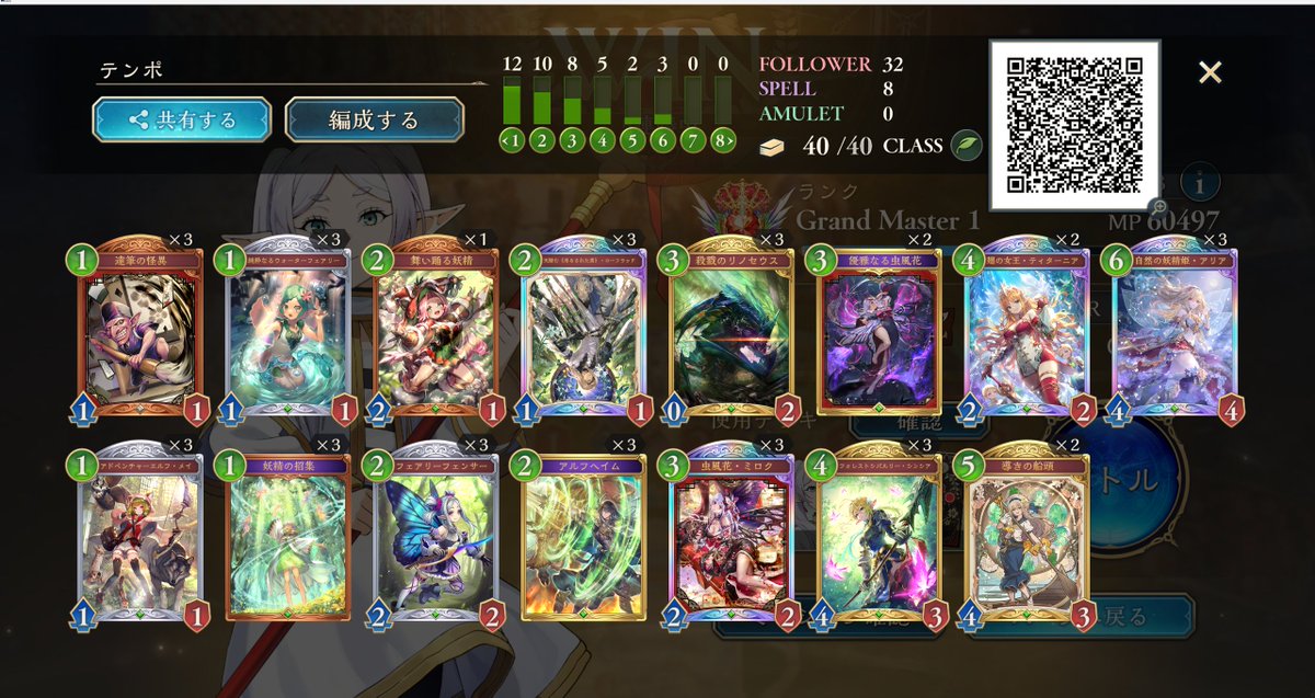 グラマス1行きました! 色々使ってますが、アグロよりテンポエルフで11連勝が最多連勝でした。 グラマス3まで頑張ろう! 2602 05 01 シャドバ(シャドビヨ MP33000~)