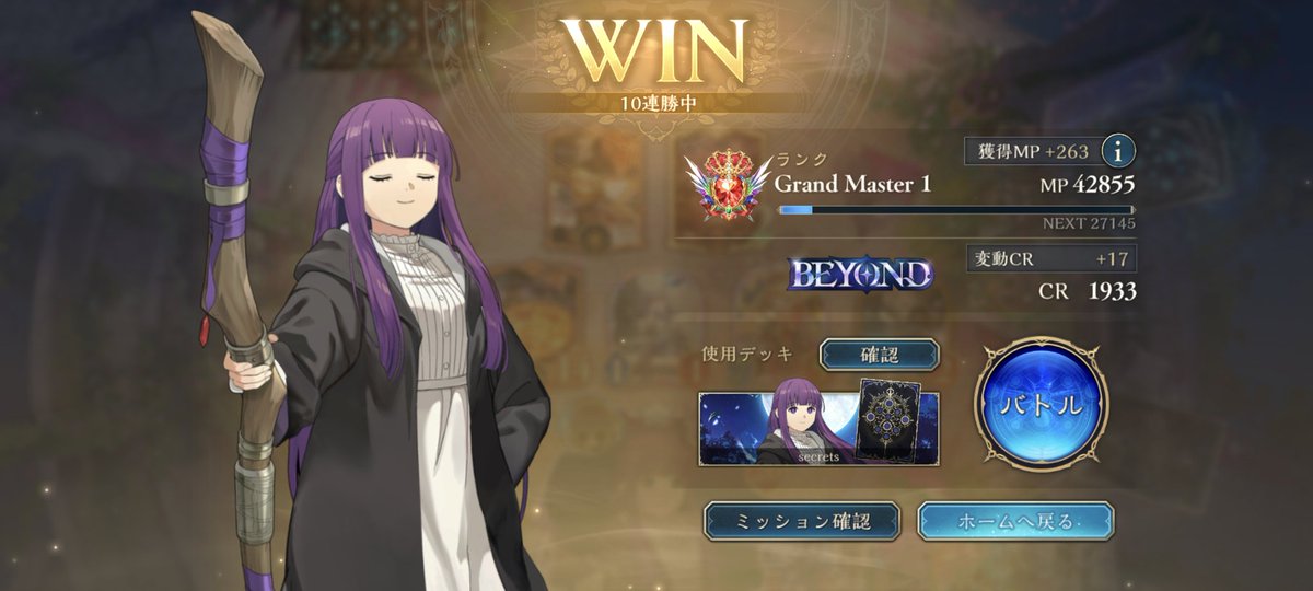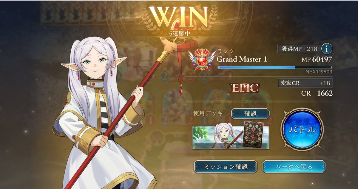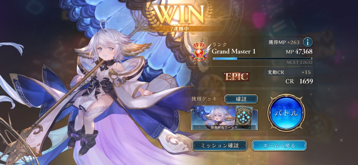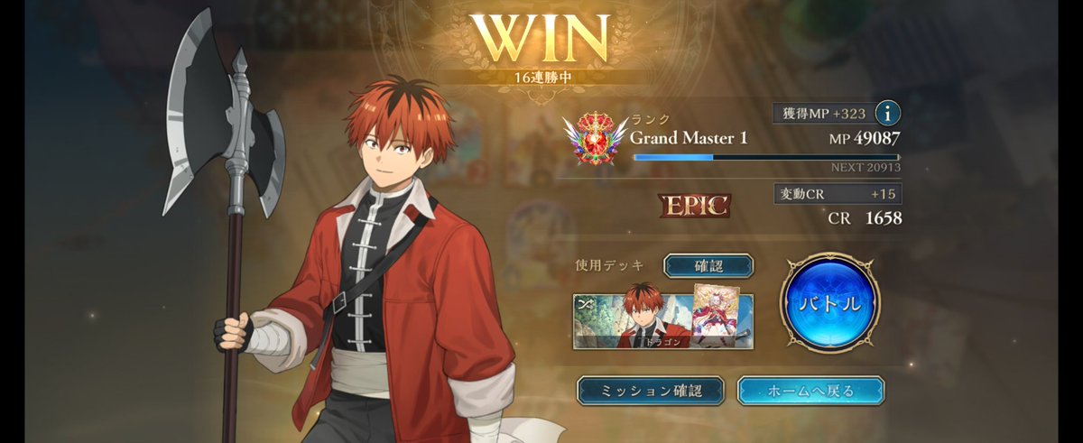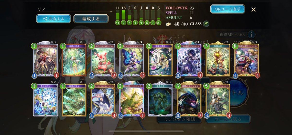グラマス1行きました! 色々使ってますが、アグロよりテンポエルフで11連勝が最多連勝でした。 グラマス3まで頑張ろう! 2602 05 01 シャドバ(シャドビヨ MP33000~)