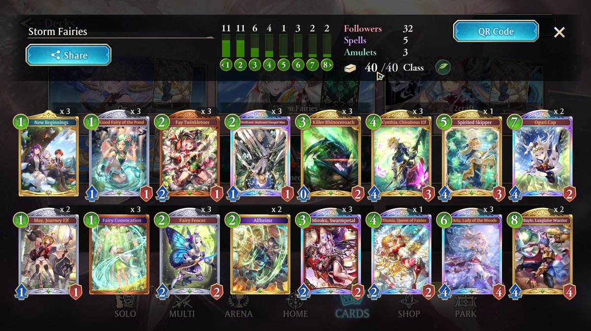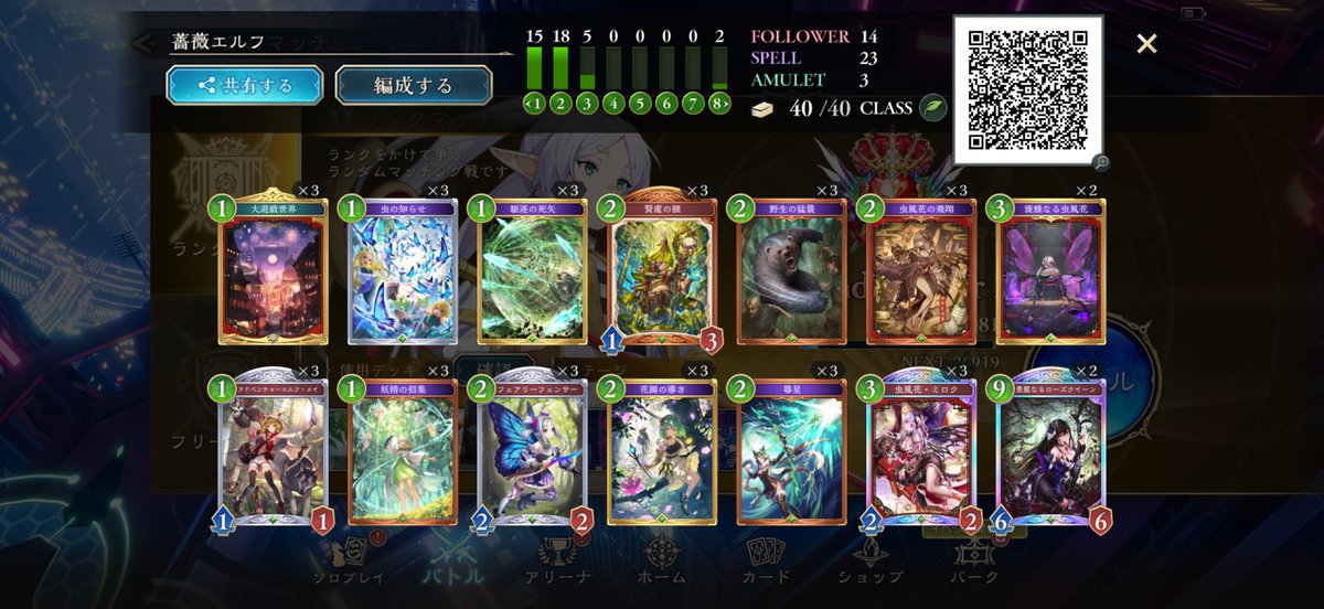 薔薇エルフで8連勝できた このデッキめっちゃ手札回って安定する! ◎風虫花 ・ミロクと組み合わせで テンポロスなく閃撃7枚作れる ◎猛襲、箒星、死矢、飛翔 ・序盤〜終盤で除去に困らない ◎賢慮の狸 ・箒星との組合せが強い (進化後に潜伏で場に残る) ・ドロソとしても優秀 #シャドバ