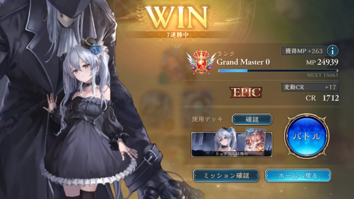 破壊ネメシスで9連勝。 10戦目に負けちゃって連勝ストップ。2桁連勝中々できんな… BEYOND目指せるくらいまできたので最終BEYOND目指してみようかな CR2080くらいないと無理か?