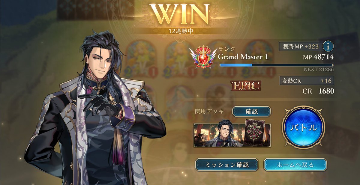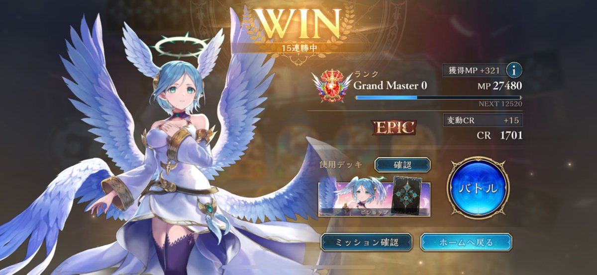 昨日からの連勝を16に伸ばしEPIC昇格! さすがに1650は超えるかw オーディン入りのほーちゃん ロングゲーム苦手で負けるしネプチューンに超進化きって勝ったことない気がするから抜いてる #シャドバWB