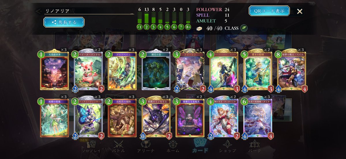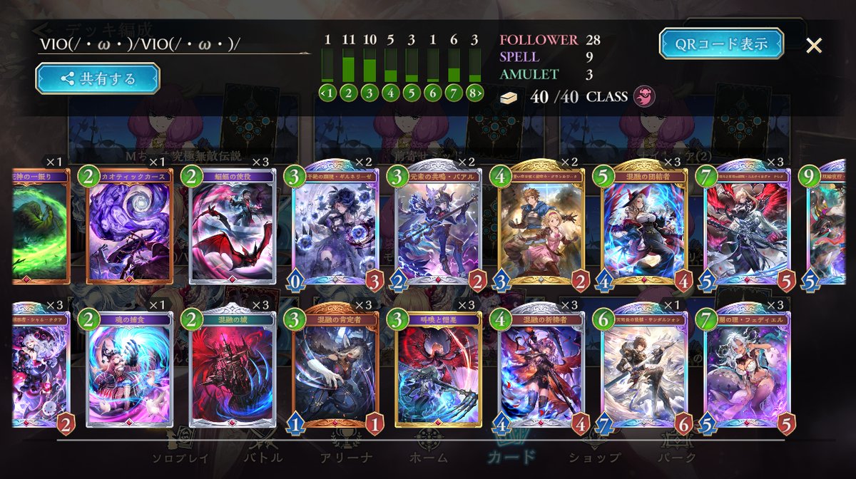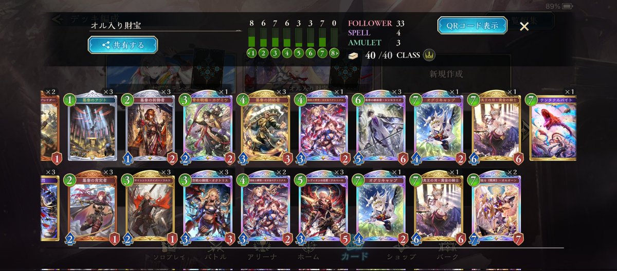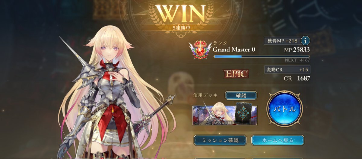 シャドバ 財宝ロイヤルで5連勝してとりあえずレート1687 EPIC👑 オルオーンだけじゃなく黄金騎士まで入れた謎構築ですが 倒しきれないときに黄金騎士の除去と回復で粘り勝ちできたりしました ただご覧の通りドロソがないので出たとこ勝負感は否めない😑 #シャドバWB