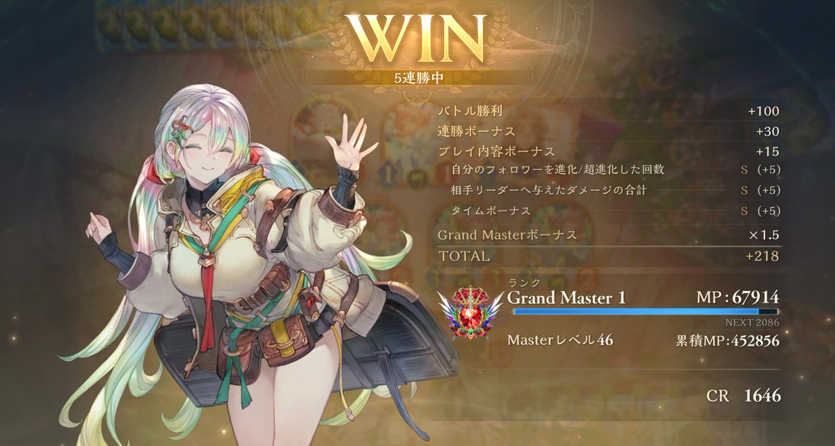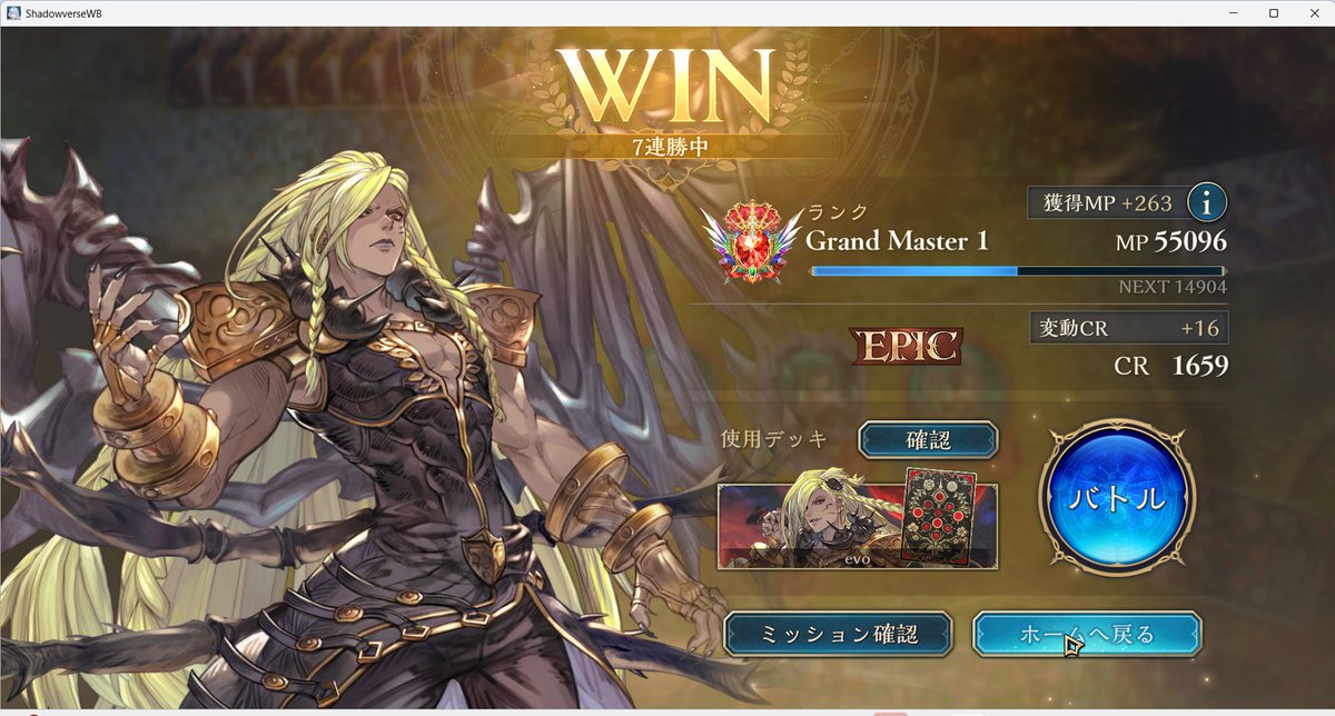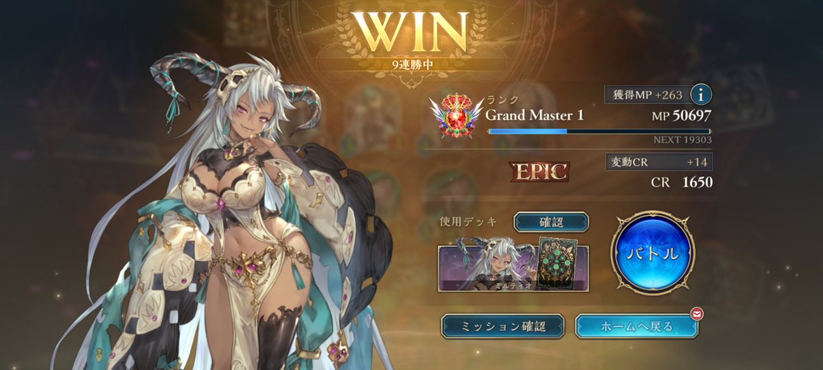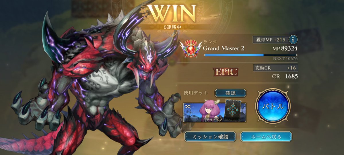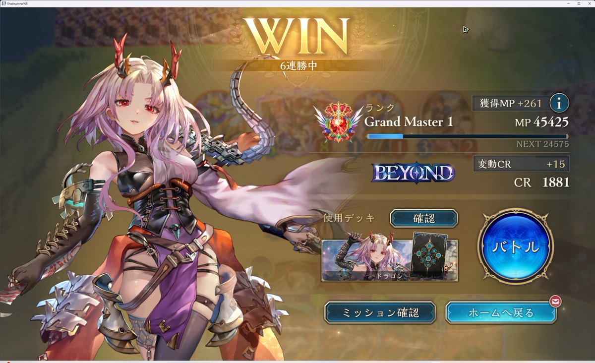 11連勝でビヨンド到着! 他クラス留学で弱点見てからは 良い仕上がりです モード達成要求が7、8ターンなので 手札入れ替えながらのゲーム進行が めちゃくちゃムズいね今期! 前半苦しんだけど僕が下手な だけだったみたい、全然強えっす ハンド沢山入れ替える分後半の バカ盤面連打が安定してるのね