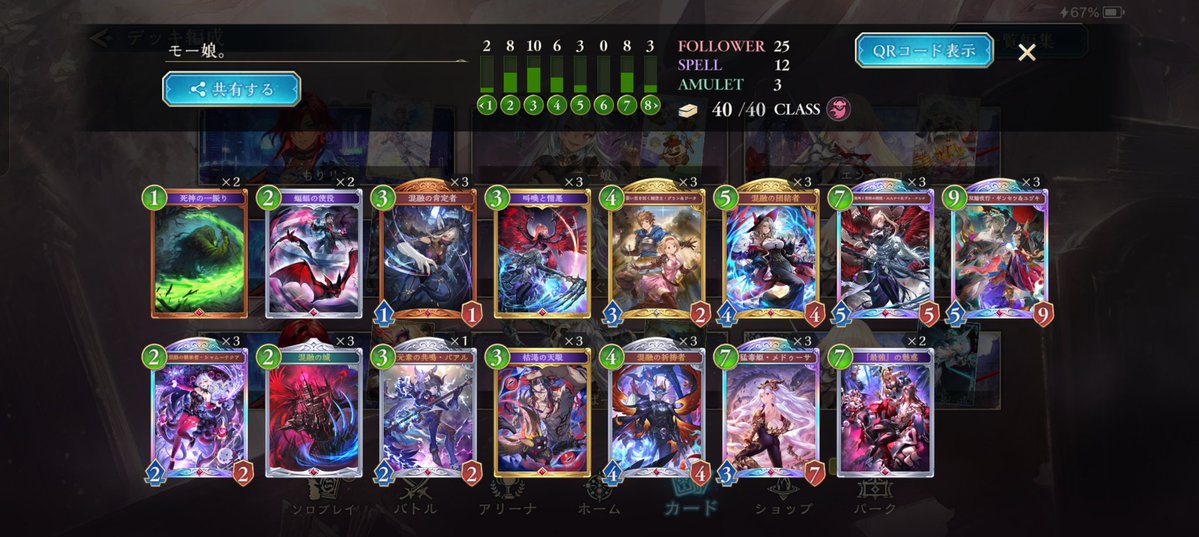 結局、ディスカドラゴンに戻ってきたら7連勝まで伸びたので良きでした。 果断が偉いと思って3投したら手札溢れすぎ。 サガツマツは7で投げないので2投にしてみたけど、なんか不安。 遮断は可愛いから入れてる。 永遠に構築迷子 やっぱ呼び声なのか? #シャドバWB
