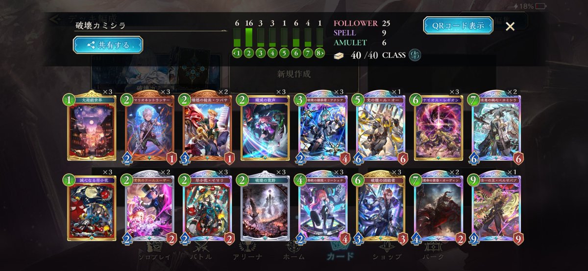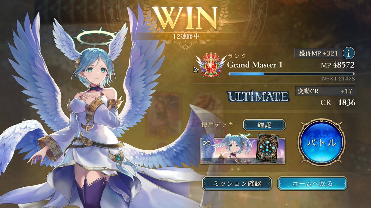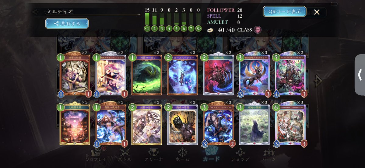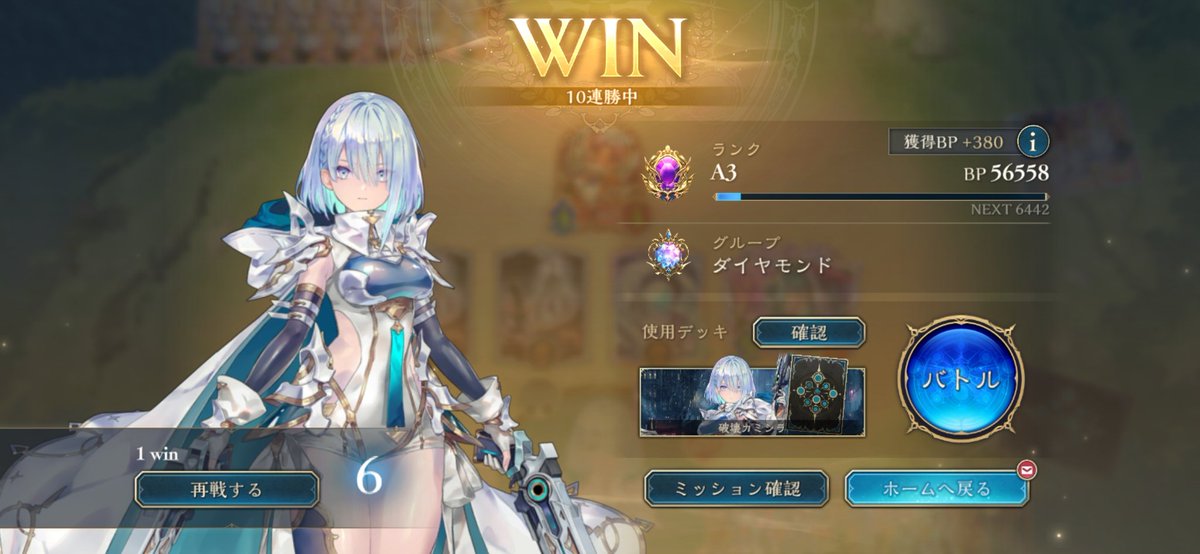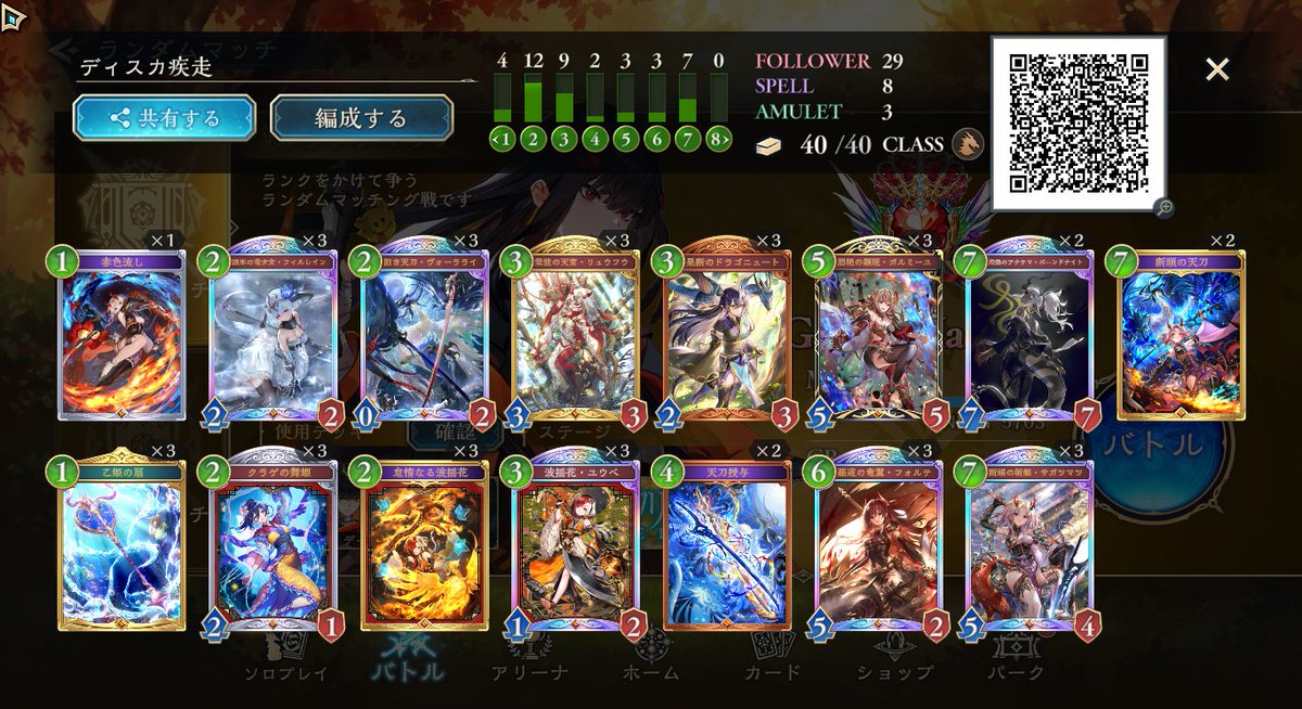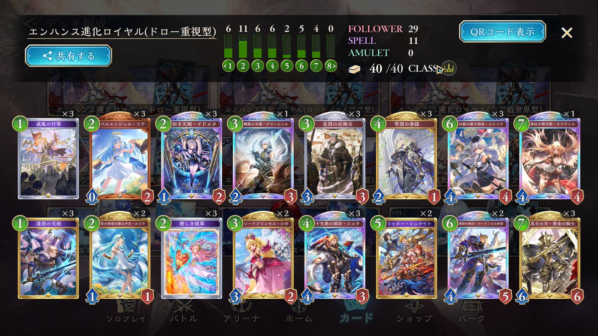 シャドバWB エンハンス進化ロイヤルで10連勝しました。 構築は前回と同じで、CRが上がって来た分むしろ勝てなくなるかと思ってましたが、今の所良い感じです。 グランプリ同様、回復と守護で耐えて最後シエテの解放奥義で決めています。 ロゼが2枚になってる分、ちょっと5ターン目の択が少ないかも。