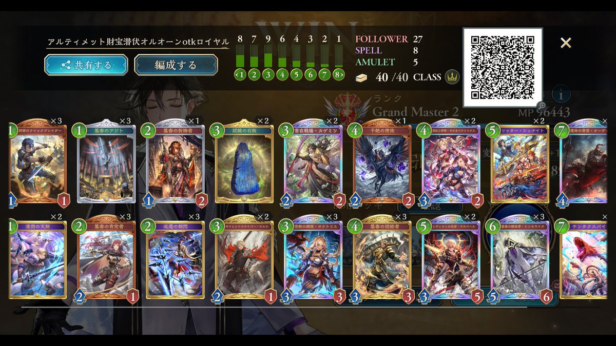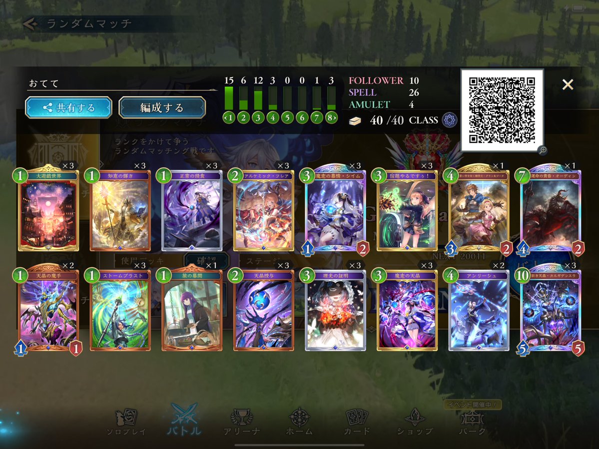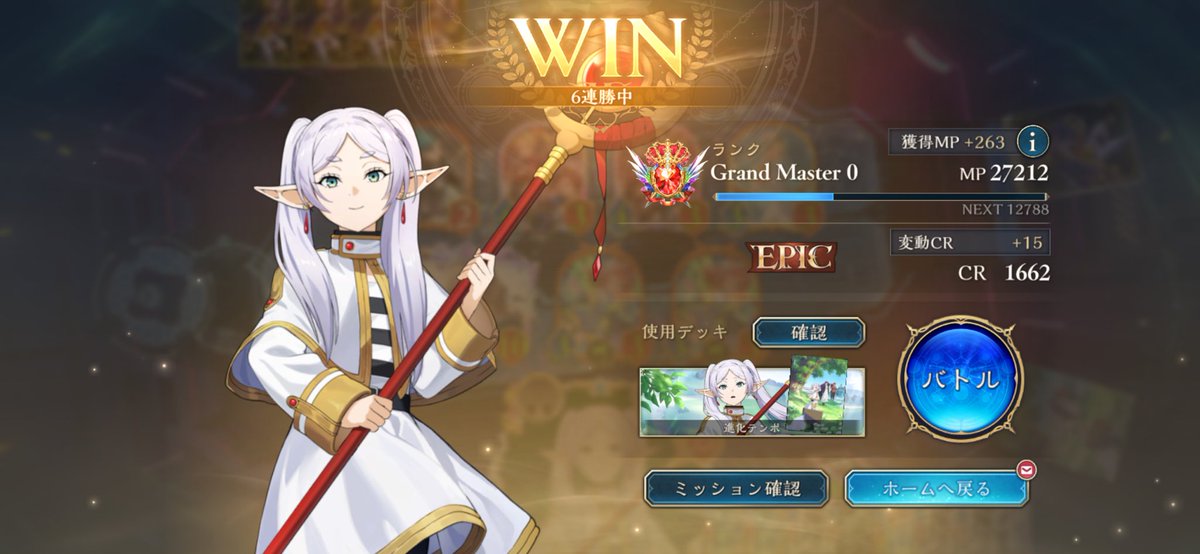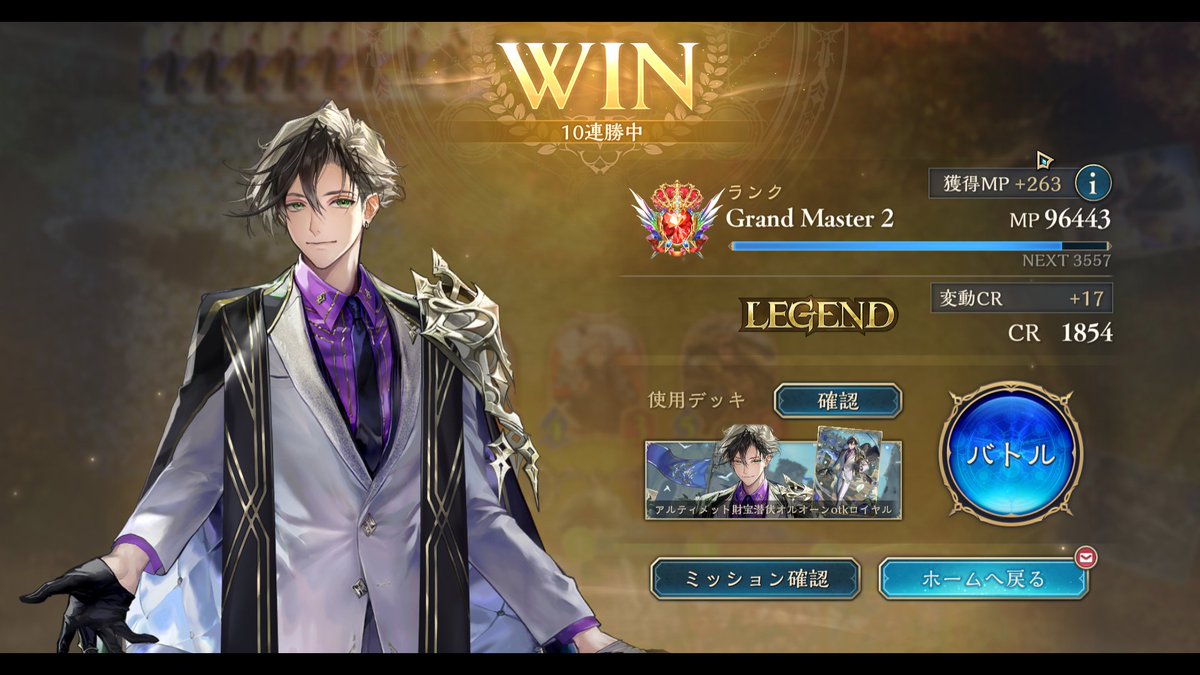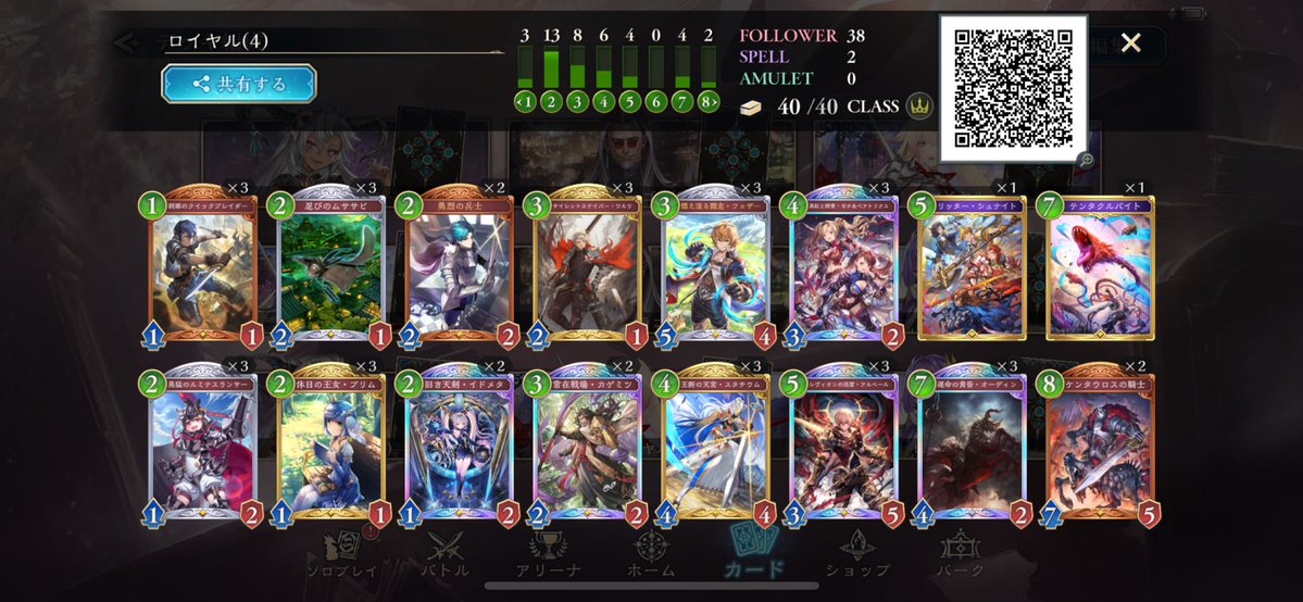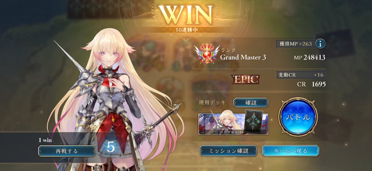 LEGENDに到達してたロイヤルが1500台まで落ちてしまって潜伏OTKロイヤルで10連勝でEPICに舞い戻ってきた( •̀∀•́ ) まだまだ低レートだけど勝てそうだから潜伏ロイヤルでまたLEGENDに戻る! ムササビ倒されてもほかの勝ち筋は沢山あるし1試合の時間も短めで◎ #シャドバWB #シャドウバース