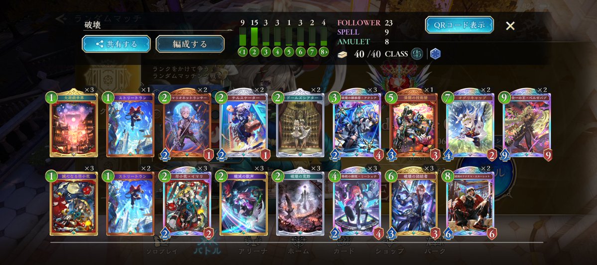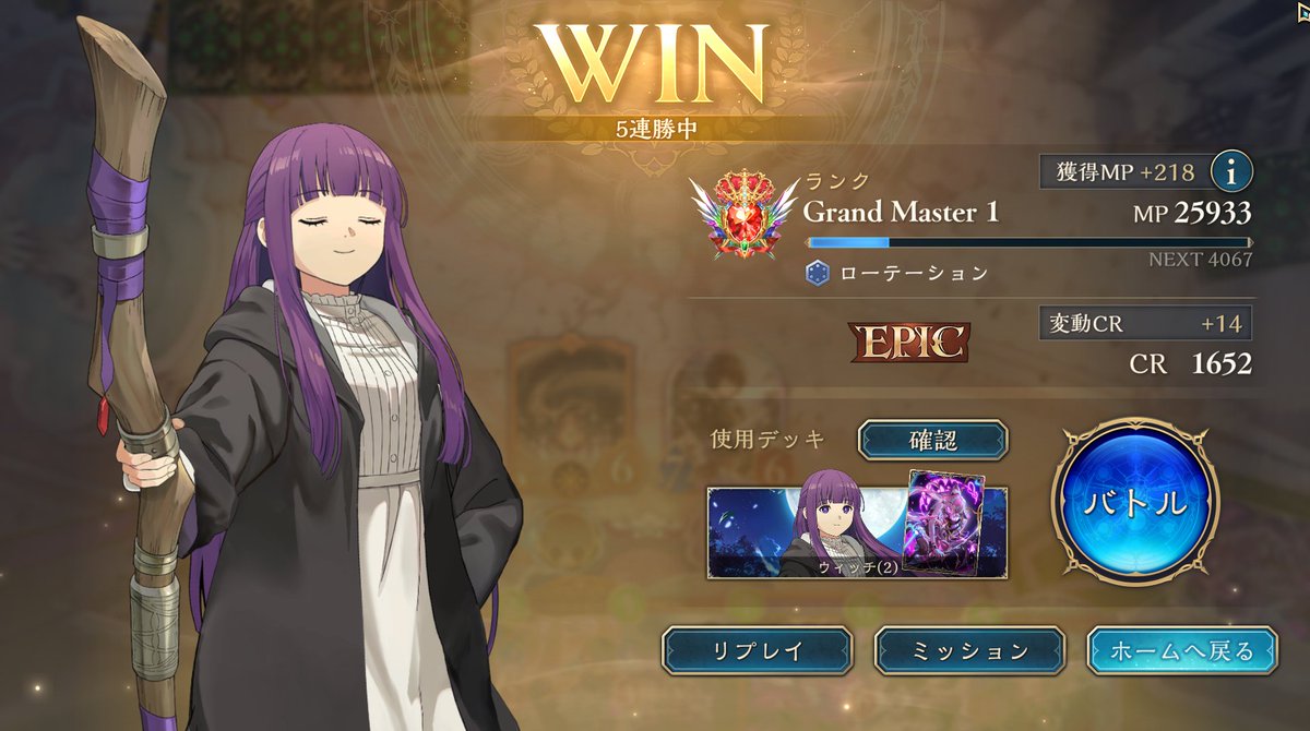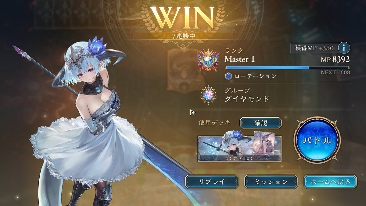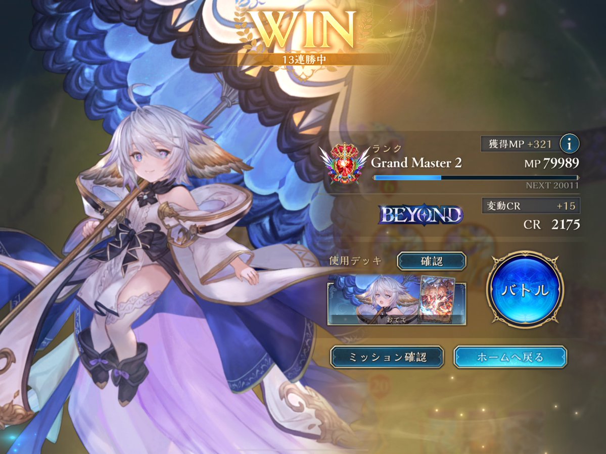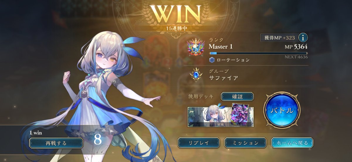 進化エルフで14連勝! ナイトメアとかロイヤルの横展開に対してミロクマルルが強いしドラゴンの威圧に対しては天槍やクピタンが強くて対応力があって使いやすかったです ヘイレムハニィは着地できればかなり強くて良いカードでした #シャドバWB