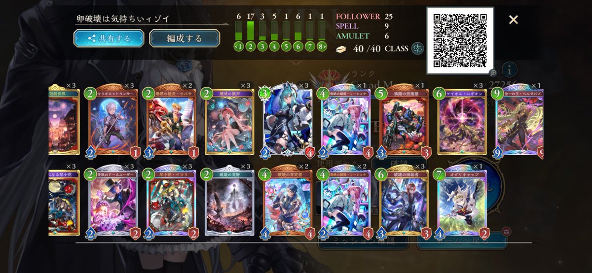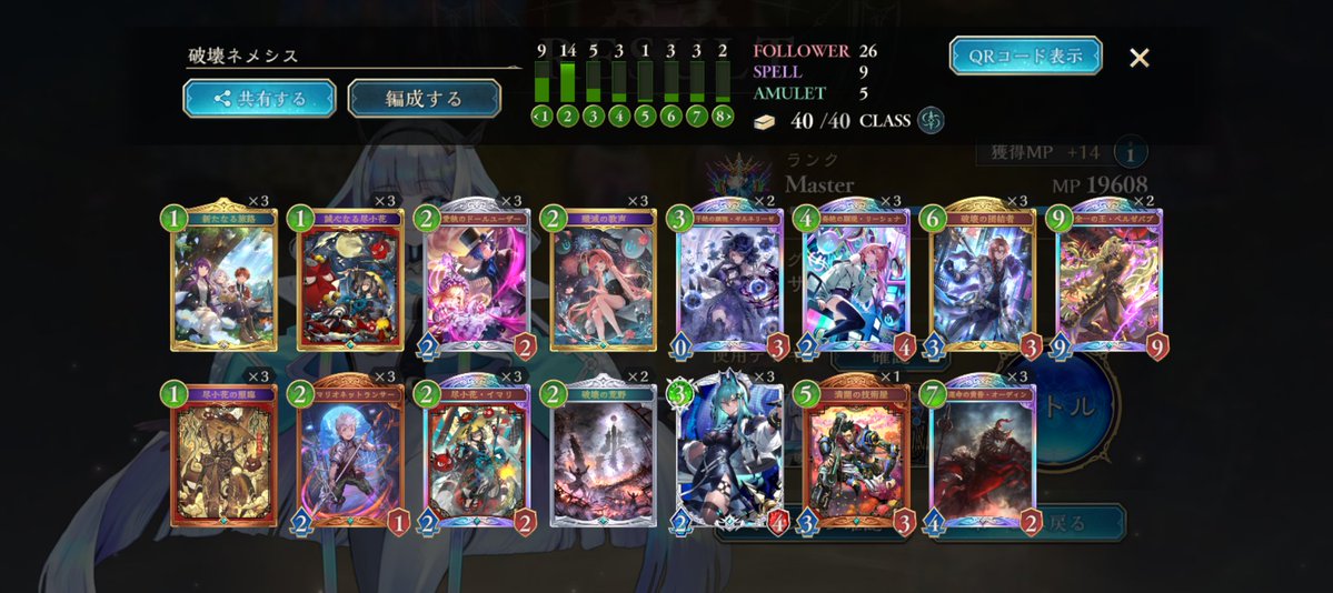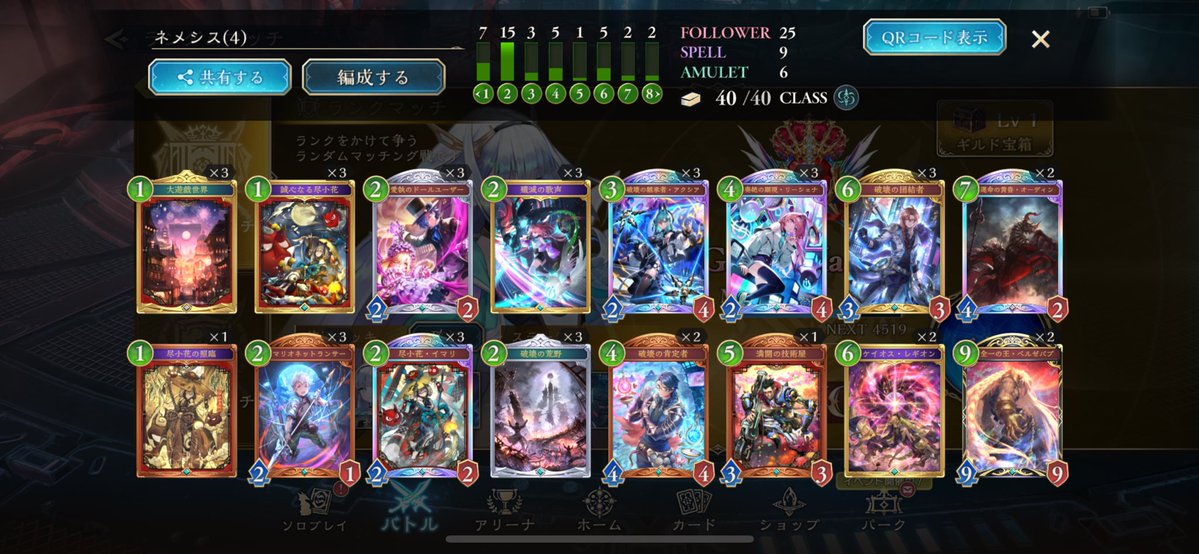 #シャドバWB 破壊ネメシスで10連勝達成しました 肯定者で7ターン目アクシア、肯定者の動きができるのが環境に多いクキシロに対してとても有利に動けるのでかなり感触良いです ベルゼバブはビショップ対策に入れてますがあんま活躍してないのでオーディンの枚数増やしてもいいかなと思います