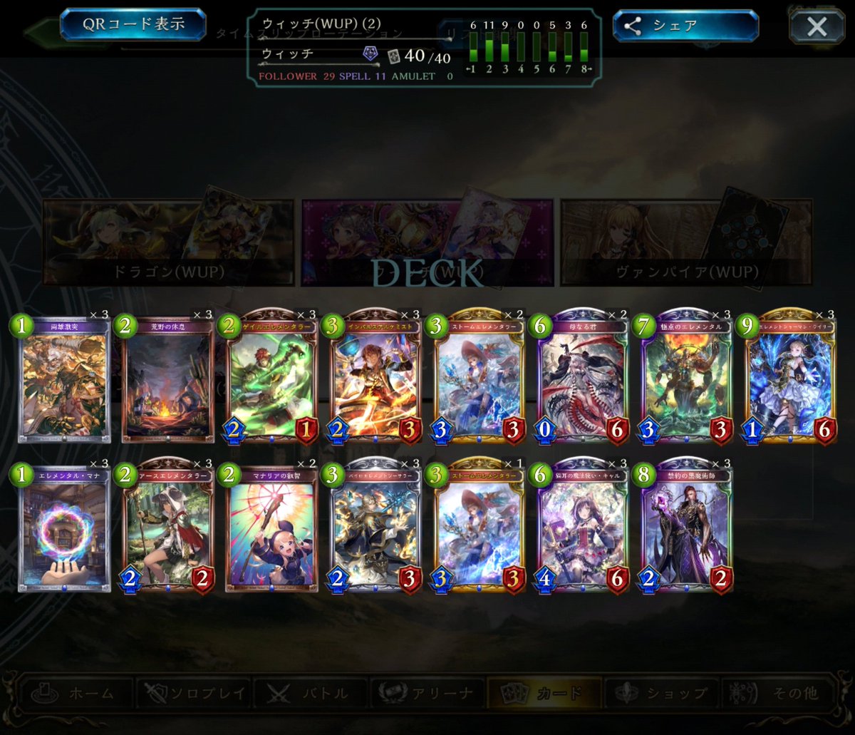 #シャドバ 今日の分のランクマ 使用デッキは自然ウィッチ。 12連勝できました。 事故がなければそれなりに強いですね。 ガブリエルはキャルを引けてない時に打点を無理やり上げるために採用しました。 アースエレメンタラーかわええ〜。