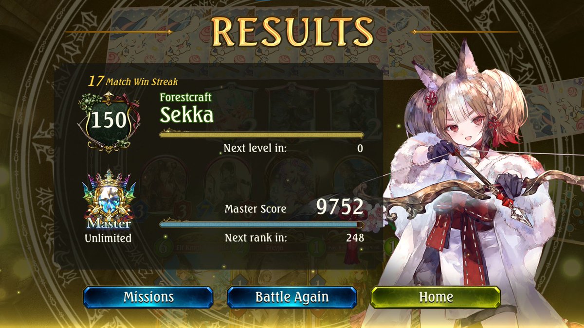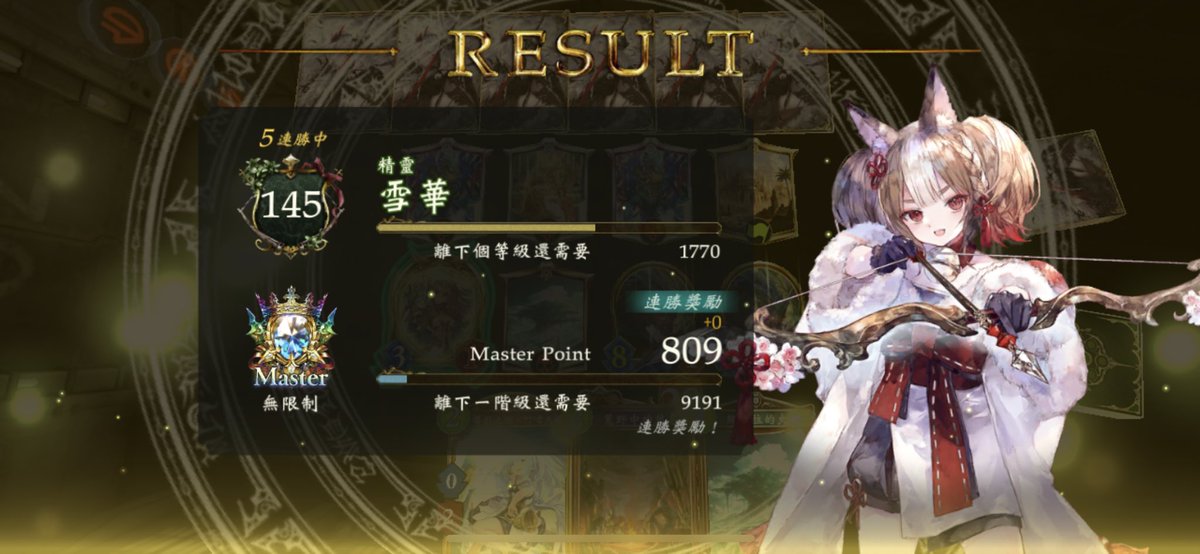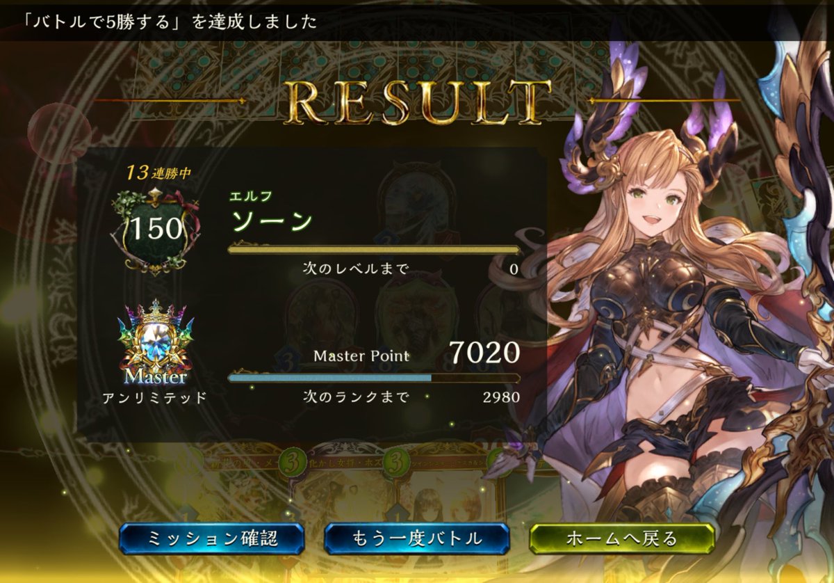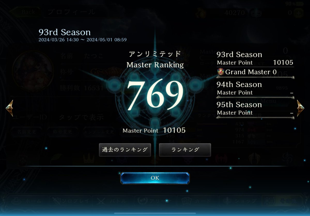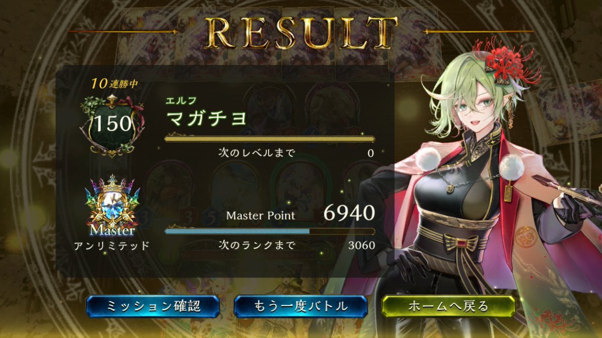 #アンリミ HOSグラマス行けました🌸 エルフonlyでアンリミ22弾連続グラマス!! MP10000で1000位狙えそうだったので駆け込みました 勝利数は100位以内に載らなかったので不明🌷140勝くらいかな 最高連勝は13が2回🌼 超越が減ったのでレーネを外しました、ダメカ少ないのでやりやすかった🌷