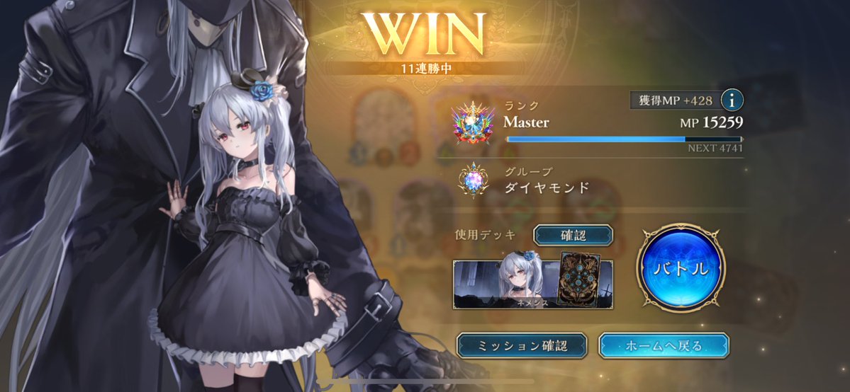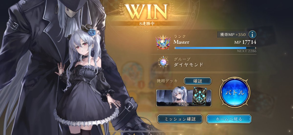 ギリッギリでダイヤグラマス到達 人形ネメシスで最大11連勝2回 残り6200pでシーズン変わってルビーまで落とされた時は終わったと思いました… #シャドバ