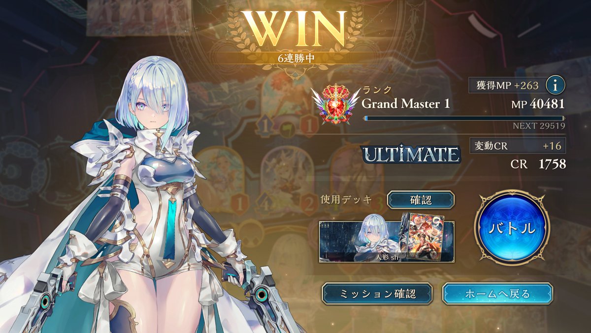 人形ネメシスで6連勝でULTIMATEきちゃ😚 オートマタアサシン3枚目、ノア、ケイオスレギオンの枠だけ迷ってる🤔 とりあえずショウさんが異常に強いのだけは分かったw