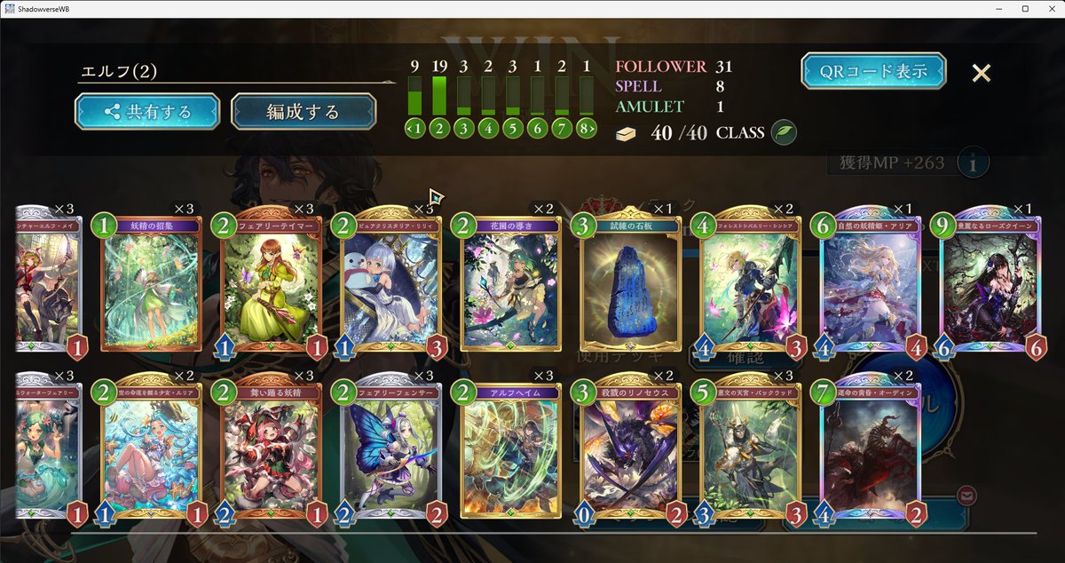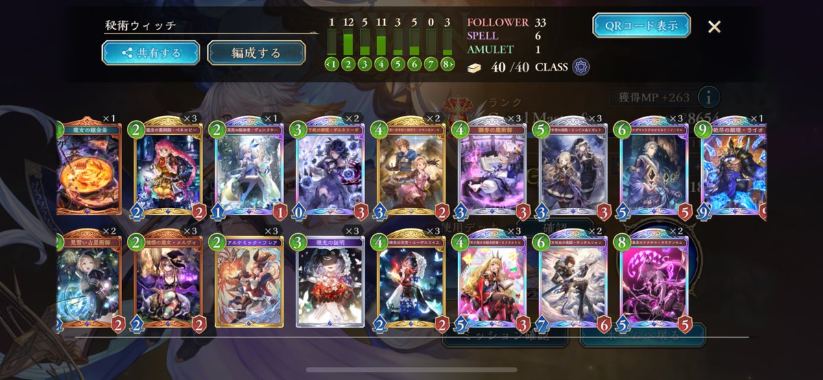 クレストビショップで7連勝 7連敗して1490台まで落ちましたがこの構築で勝てるようになりました。 足を引っ張ったカード ・ウィルバート←テンポロスしてるときに出すとオデンで死ぬ ・サレファ←団結者、ギルネ用の進化が残らなくなる ・ジャンヌ←秘術、財宝に対して役割が無い #シャドバWB