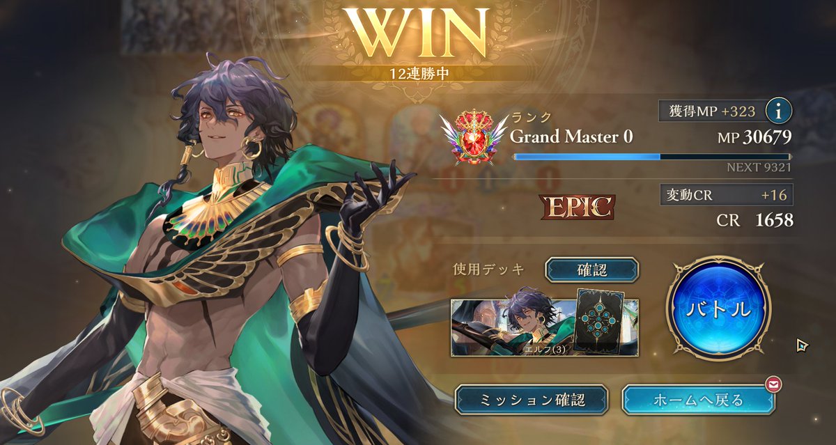 進化ロイヤルでレジェンド達成!リストはユーリさんのリストを借りています。11連勝(エルフで4連勝、ロイヤル7連勝)アルティメットからストレートで行けました。財宝と違って秘術に対して有利とれているのが使用感がよかったです。見切れているのはプレミアのアマリアです。
