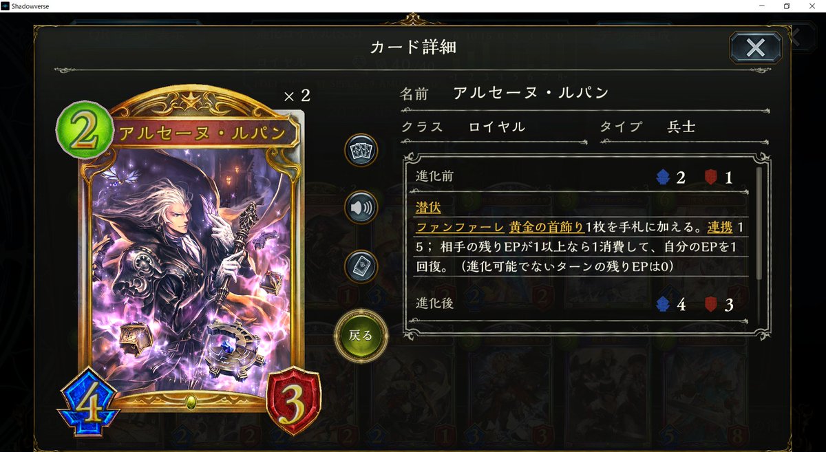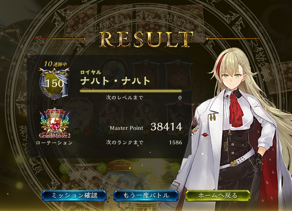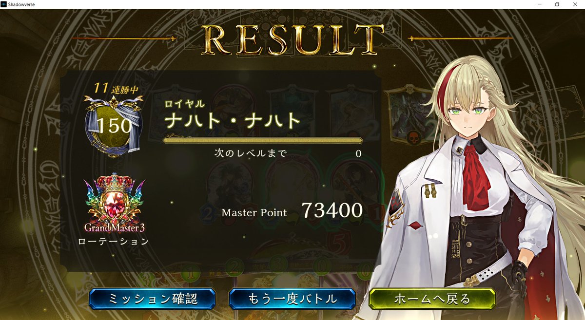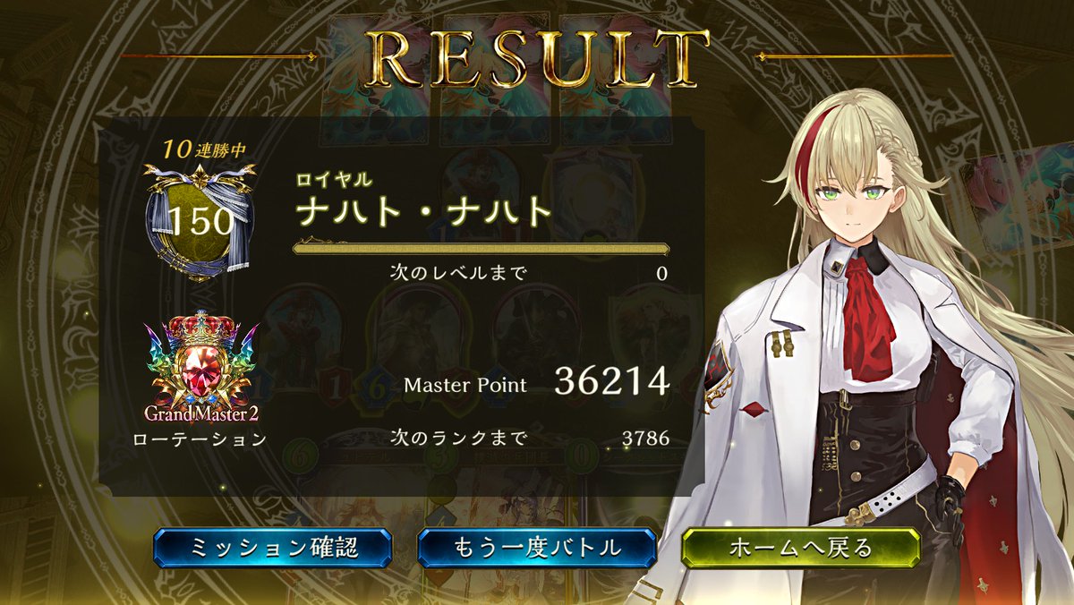 連携寄り進化ロイヤルで11連勝! コントロール気味のロイヤル楽しすぎる。 プランは以下の通り。 ・序盤: 猫将軍セラで連携稼ぎ ・中盤①: 戦地、兵団長でデッキ圧縮 ・中盤②ルパン、タケツミでEP回復 ・終盤: 4銃士、エリカ、カゲミツでフィニッシュ レジェンド枚数はこの辺りが限界ですかね。