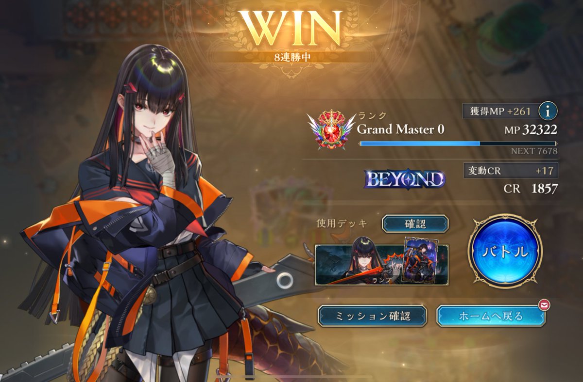 熱血ランプドラゴン8連勝でBEYOND!! 魔手ウィッチ、進化エルフ、進化ネメシスあたりがキツくてウィルナス3投 1番負けた対面は疾走型アミュレットビショップ