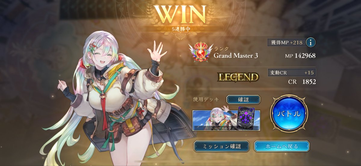 進化エルフでレジェンド達成 最後は5連勝 5つ目レジェンド! 進化テンポ伸び悩んでたのでシンプルに進化早い方が勝ちそうと思って持ち替え成功 残り2クラス頑張ろう