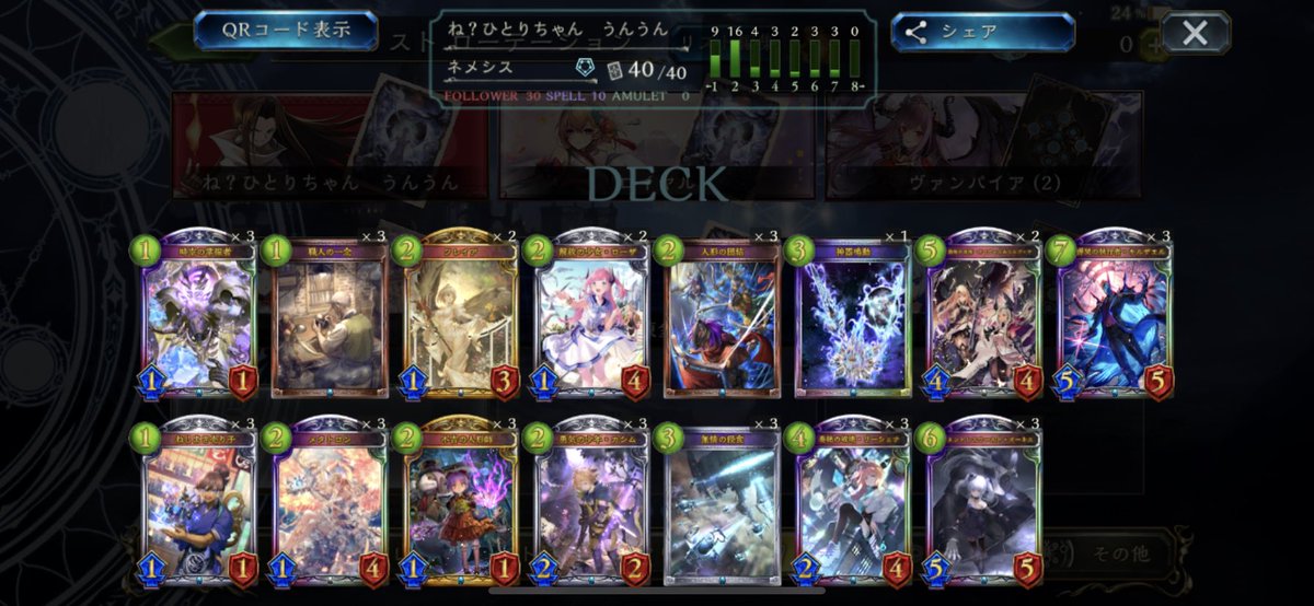 八獄ネメシスで39連勝達成!! 40連勝ならずも、自己新記録! スペルと狂乱の上振れ、ミラーにヒヤヒヤしながら何とか... フィニッシュの択はある程度決まってるが、どの対面でもケア・解答を考えることがあって楽しいデッキだった #シャドウバース #シャドバ連勝