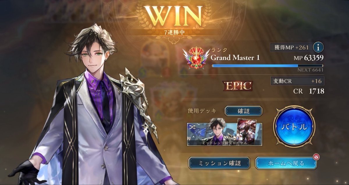 LEGENDに到達してたロイヤルが1500台まで落ちてしまって潜伏OTKロイヤルで10連勝でEPICに舞い戻ってきた( •̀∀•́ ) まだまだ低レートだけど勝てそうだから潜伏ロイヤルでまたLEGENDに戻る! ムササビ倒されてもほかの勝ち筋は沢山あるし1試合の時間も短めで◎ #シャドバWB #シャドウバース