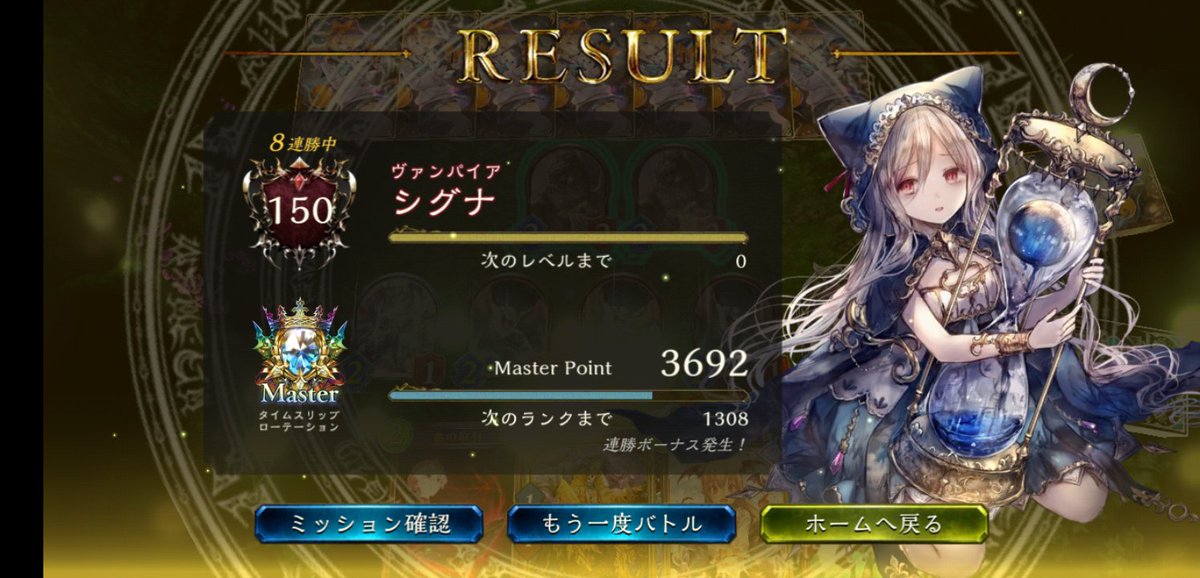 シャドバで今期もヴァンプのみでタイムスリップローテーション(ローテ)とアンリミ共に両グラマス達成‼ STRバフヴァンプ型アグロヴァンプ(蝙蝠ヴァンプ)で、8連勝&7連勝&6連勝&5連勝し、戦績63戦45勝18敗。 自傷ヴァンプ(狂乱ヴァンプ)は33戦19勝14敗。 #シャドウバース (リプ先の補足スクショ②)
