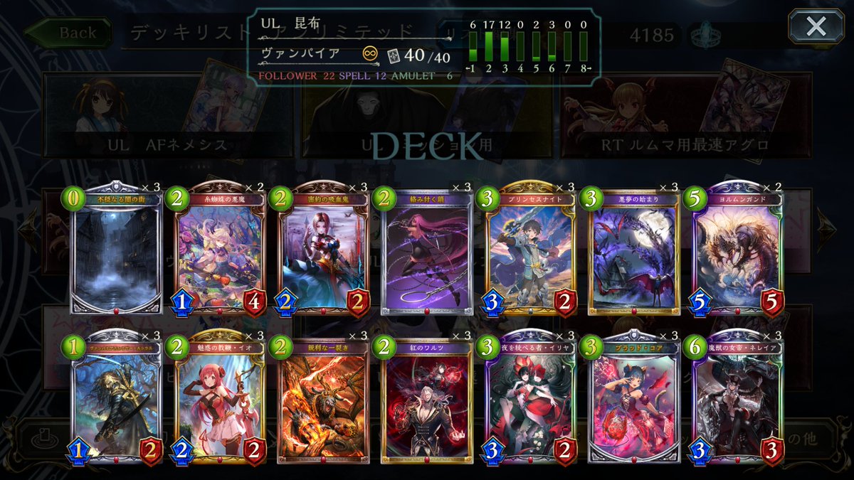 アンリミUBヴァンプで10連勝出来た! 最後はミュニエにヨルムンガンドの起動2回止められて負けました。 一般的にはユリウスの枠を糸蜘蛛の悪魔に差し替えて、アグロ耐性を高めた構成にしてみました。AFネメシスが流行らない限りは、オススメです。