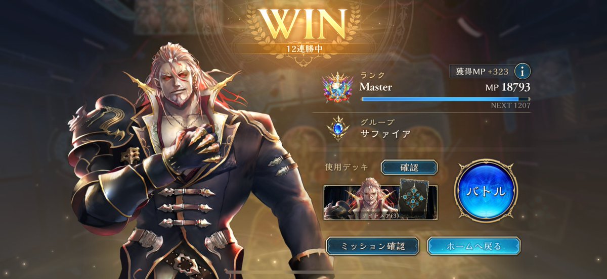 モードナイトメア12連勝〜!! サファイアだけど… そろそろダイヤに戻ってもいいサファよ?? リバチェンとギル姉の採用枚数変わりがち #シャドバWB