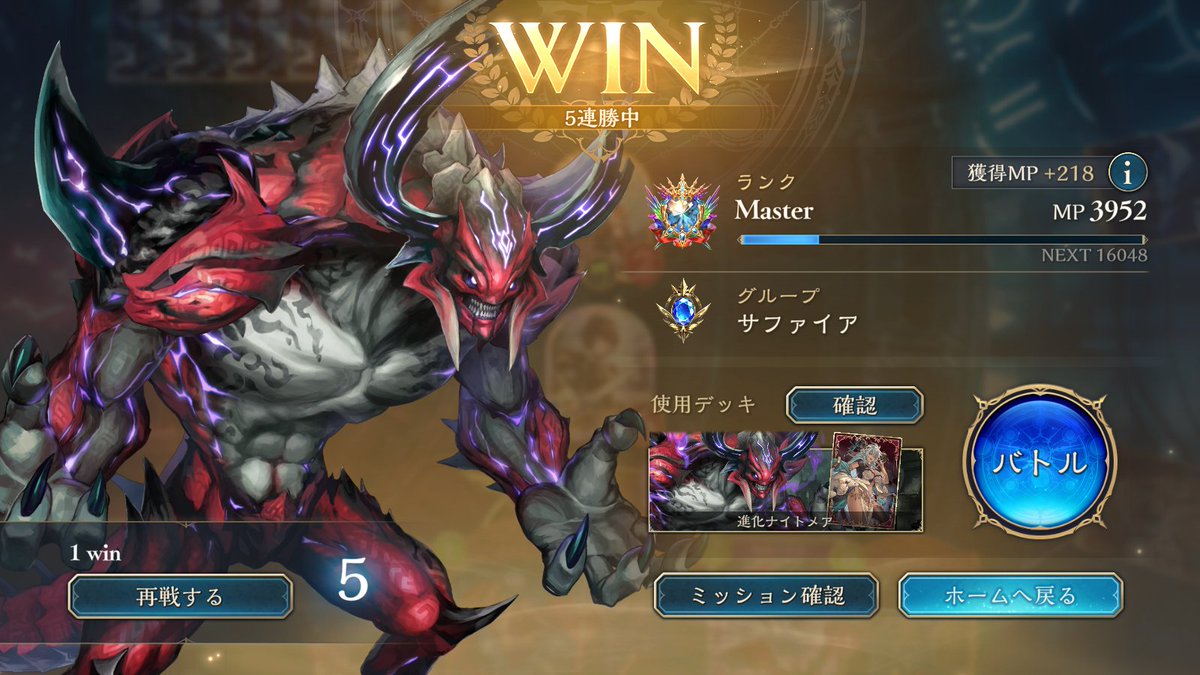 サファイアだけど5連勝出来た! 進化ナイトメア 使えば使う程ベリアルの出番が減っていくな~ でもまぁ 後ろにベリアルいるのは心強い! #シャドバWB #進化ナイトメア
