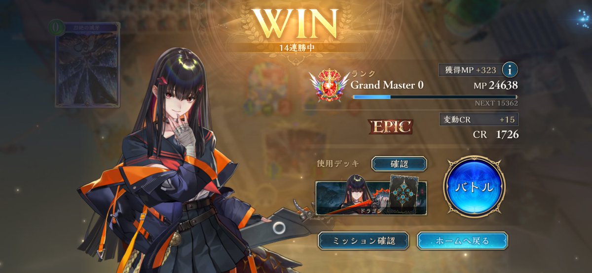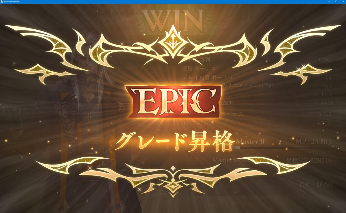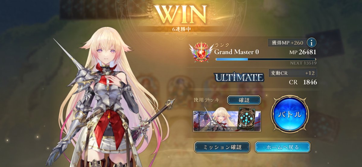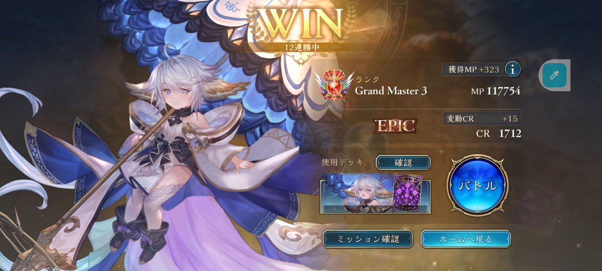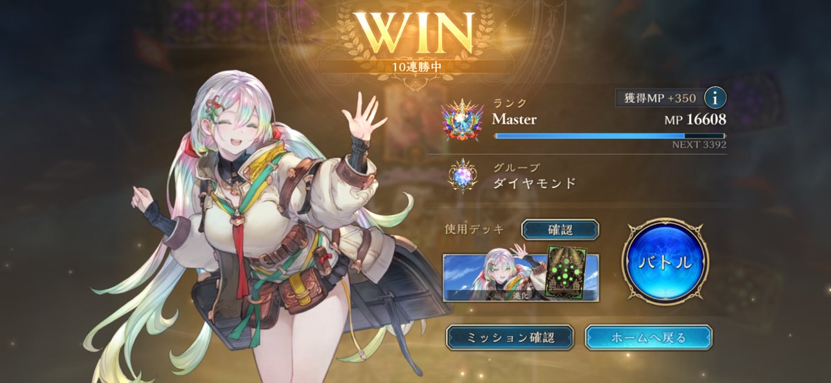 進化エルフ10連勝で昇格戦から負けて2連勝でグラマス イーウィヤ生成してないけど1回しかイーウィヤだったらなという場面しかなかったからそんなに問題は無いかな 途中からエンハロイヤルが駆逐されてミルティオナイトメアだらけになって快適になってた #シャドバWB