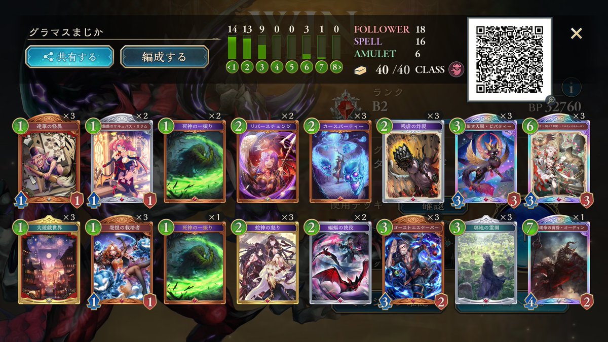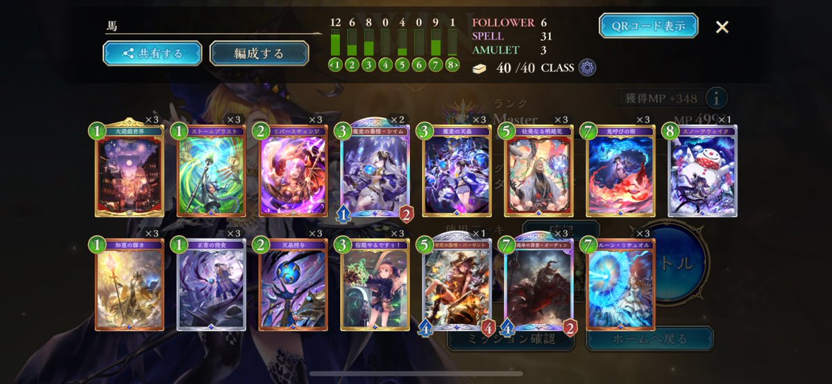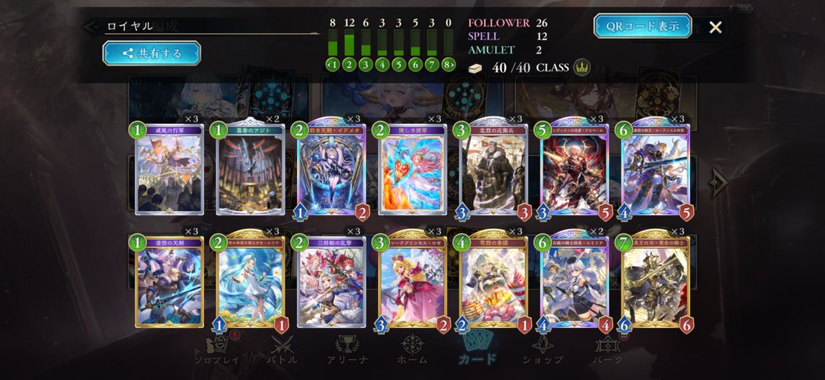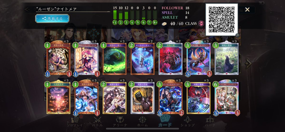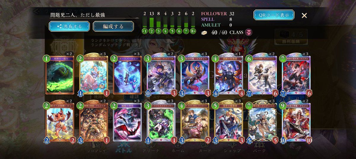 自分でもなぜ勝ててるのかよく分かんないアルメス入り進化ナイトメア エピック帯から13連勝してアルティメットまで行けました。多少運は絡みますが、まあまあ強いと思います。 構築はプロの方のやつを少しいじったやつです。 #シャドバWB