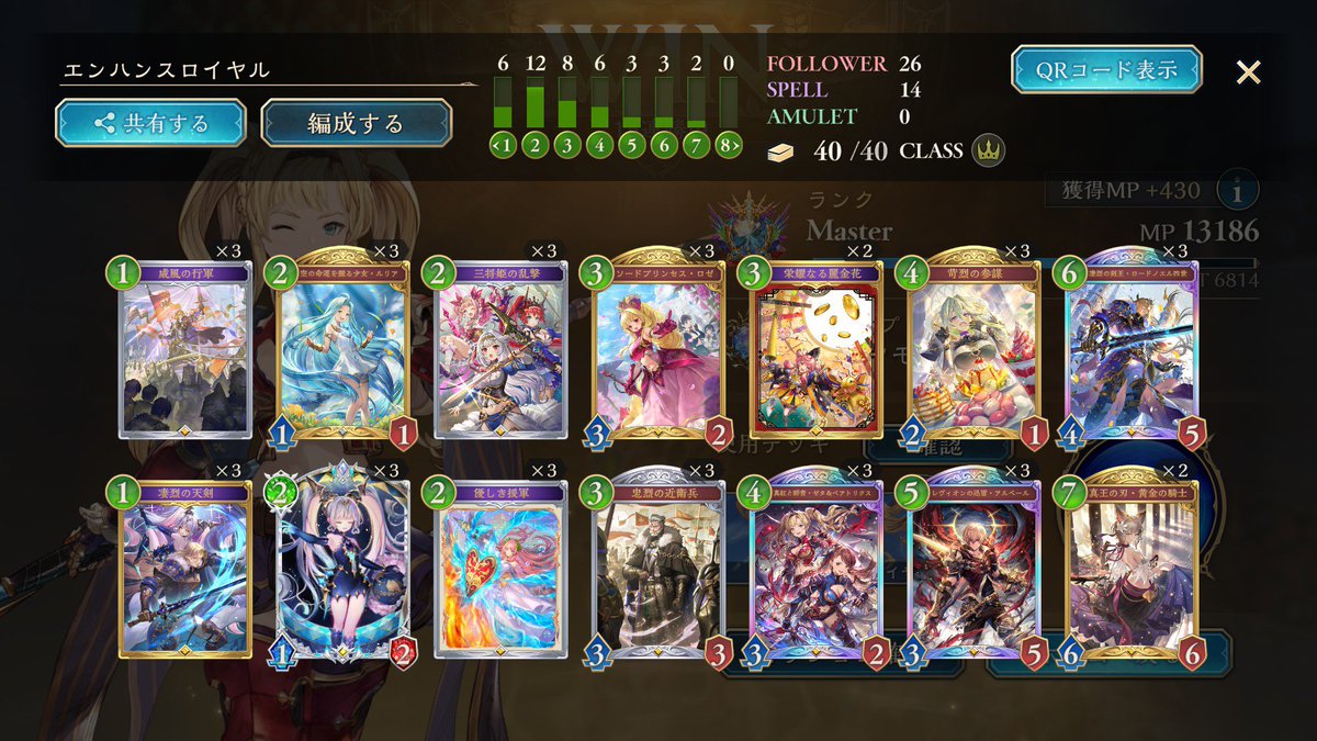 シャドバWB、進化エルフで10連勝・13連勝・ダイヤ率100%グラマス達成! 全て勝敗付けたけどグラマスまで3連敗なし! 86戦65勝21敗(勝率75.5%)でした! #シャドバWB