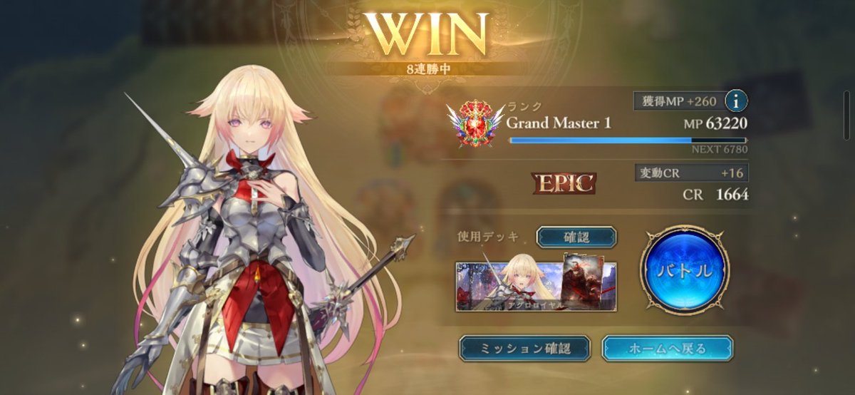 わーい、8連勝してロイヤルEpic到達! 目標が低いのは 今季復帰した勢だから許して… 使用デッキはアグロロイヤルで めいすさんのリストを参考にしました! ありがとう、めいすさん…!
