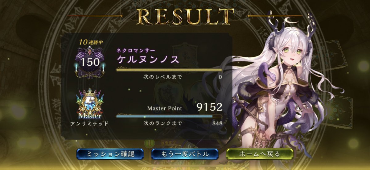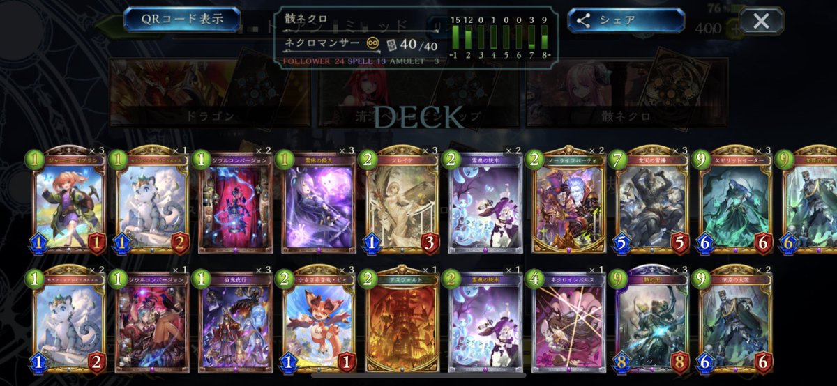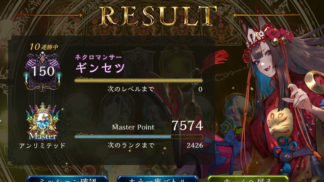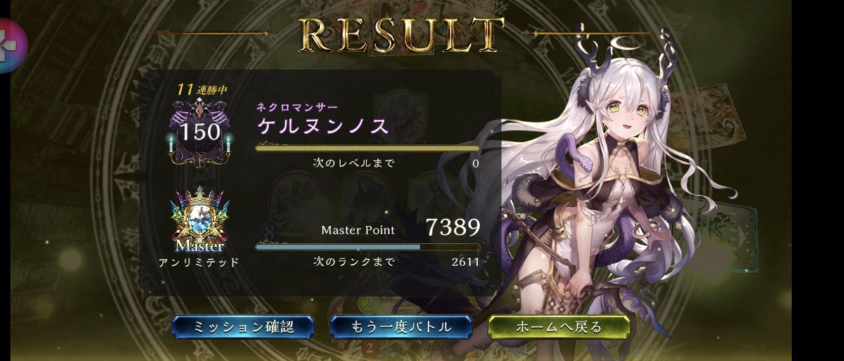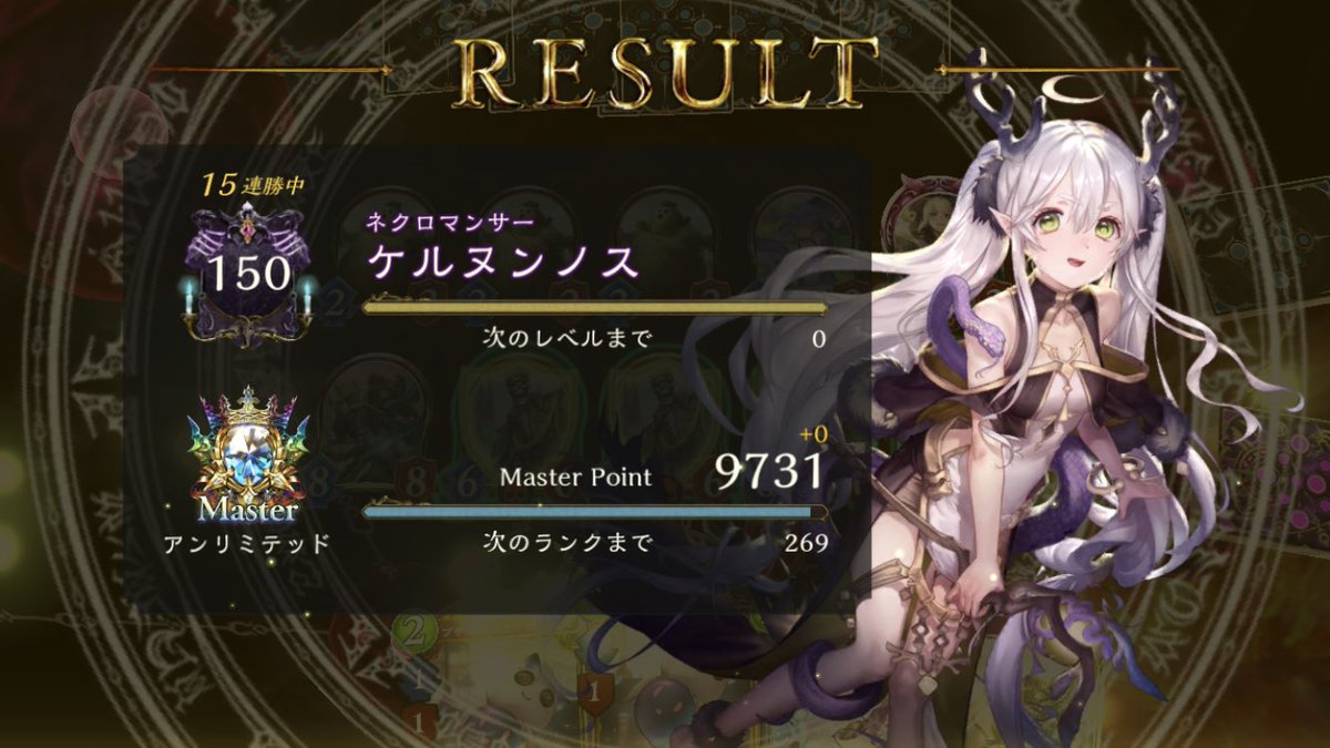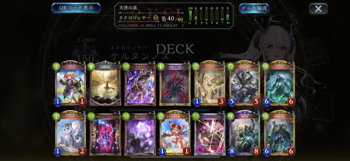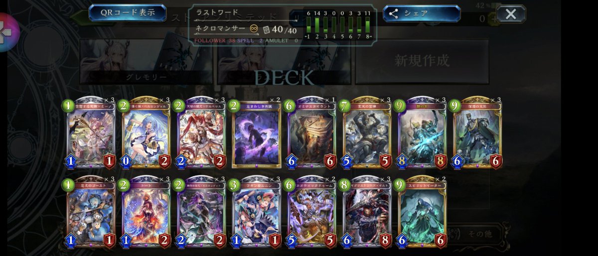 #シャドバ アンリミラスワ骸で11連勝しました 早めにパワースパイクの あるデッキには骸を 押しつけていきます。 エルフドラヴには骸 ビショウィッチロイヤルには ラスワを稼いでいきます ネメは交通事故されなければ勝てます 12戦目はネメにころされました